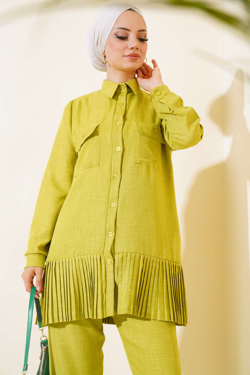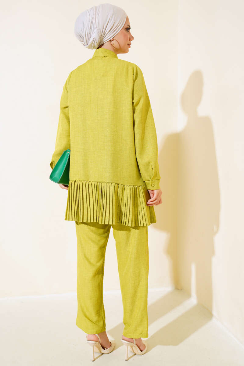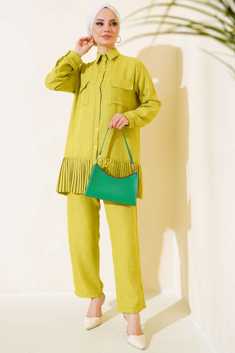 Yeni sezon ikili takım modelimiz sizlerle beraber. Tuniğimizin etek ucu pilelidir. Önü boydan düğmelidir. Göğsünde iki adet kapaklı cebi vardır. Kol bilekleri manşetli ve düğmelidir. Pantolonumuzun beli lastiklidir. Cepsizdir. Geniş paçalıdır. İkili takımımız hem şık hem sportif tasarımıyla kombin yapmak daha kolay. Renk seçeneklerimiz mevcuttur.