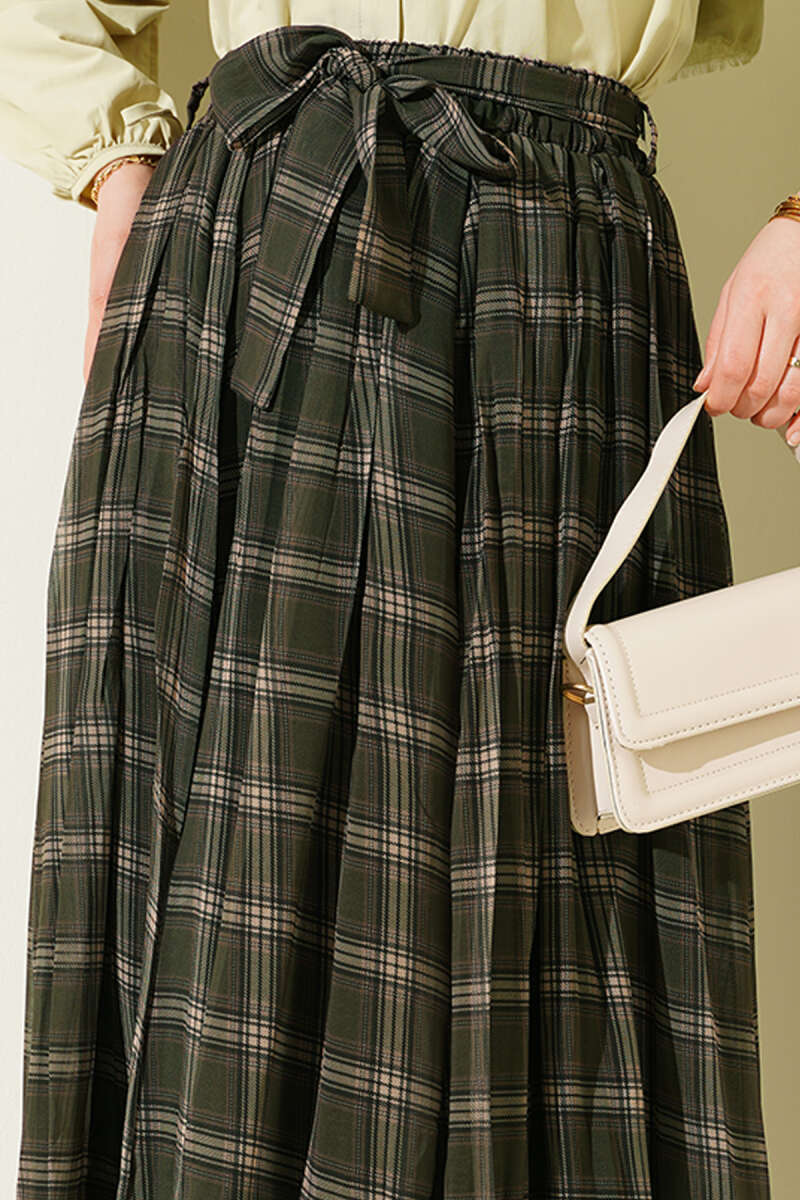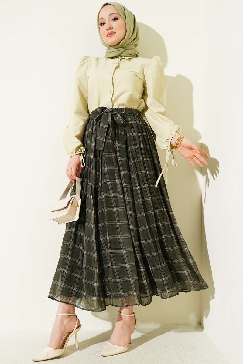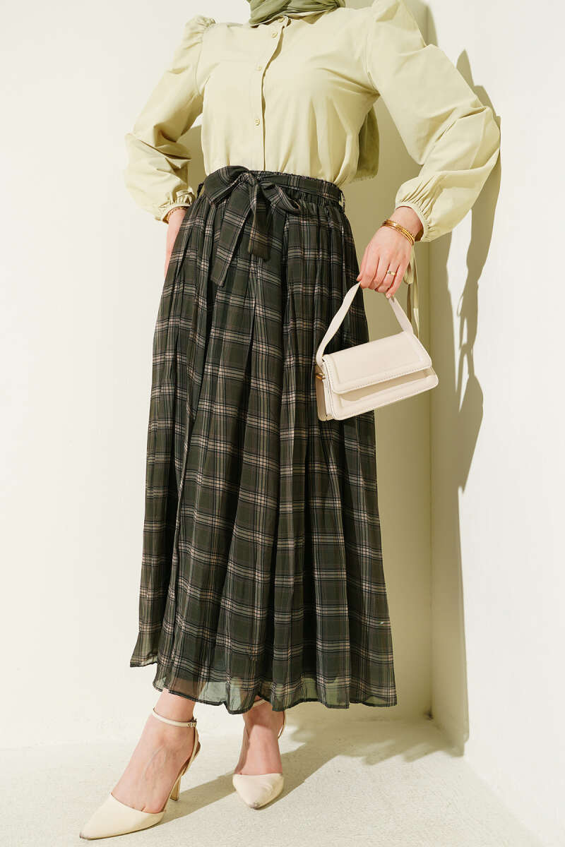Pileli Kuşaklı Ekoseli Şifon Etek Haki