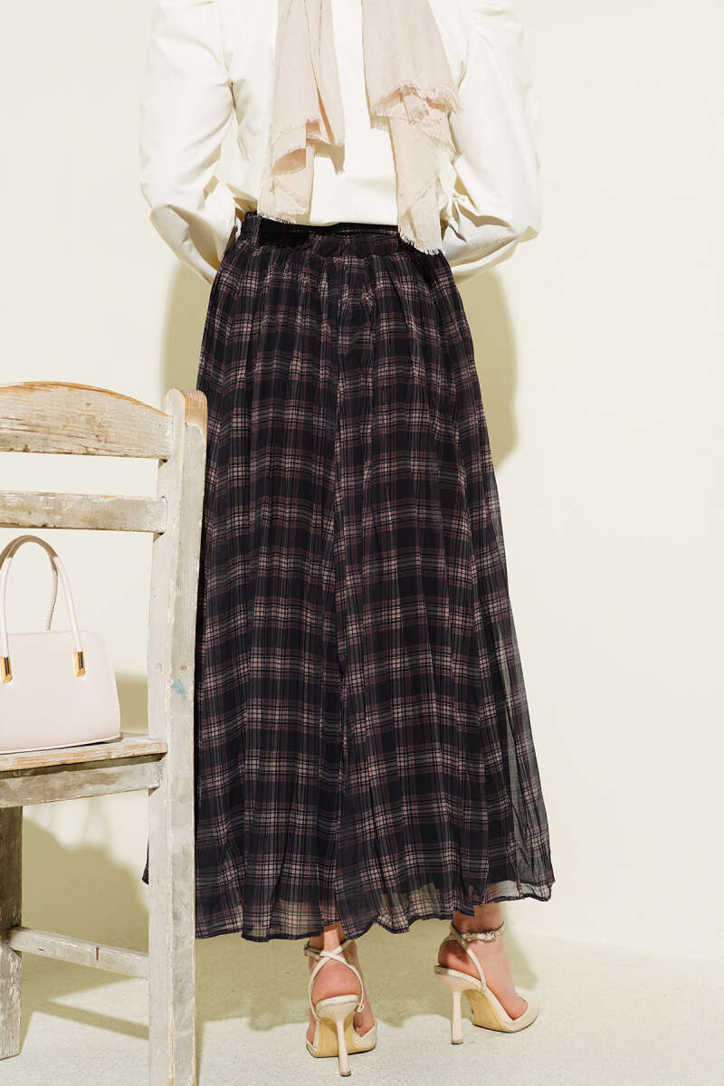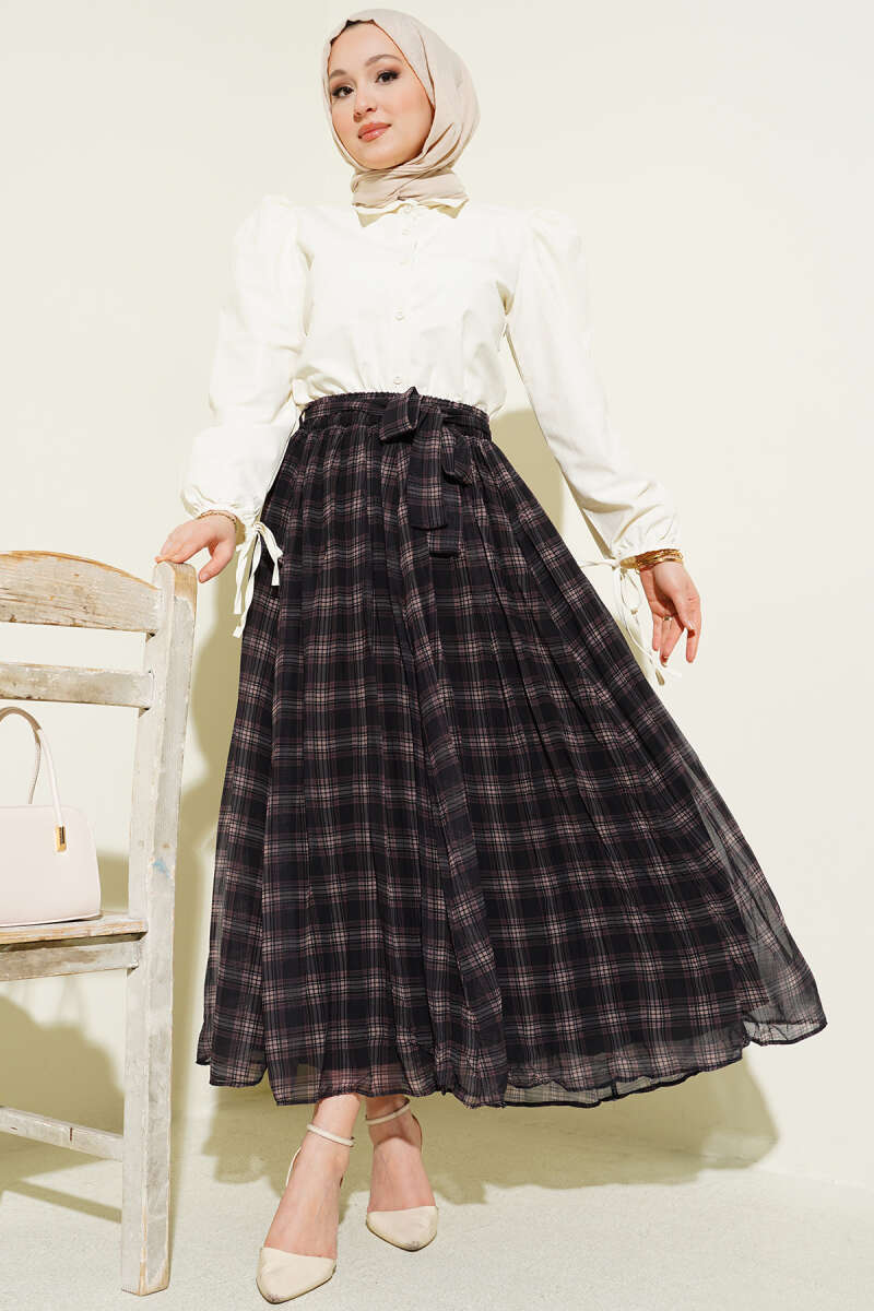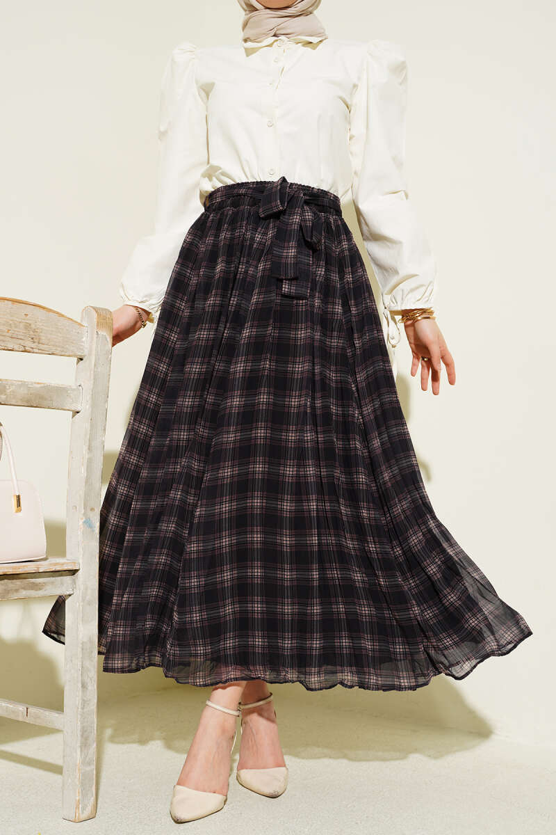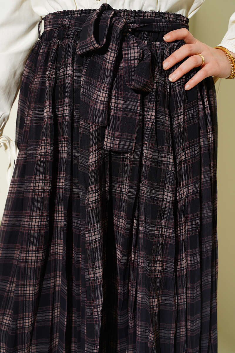 Pileli Kuşaklı Ekoseli Şifon Etek Siyah