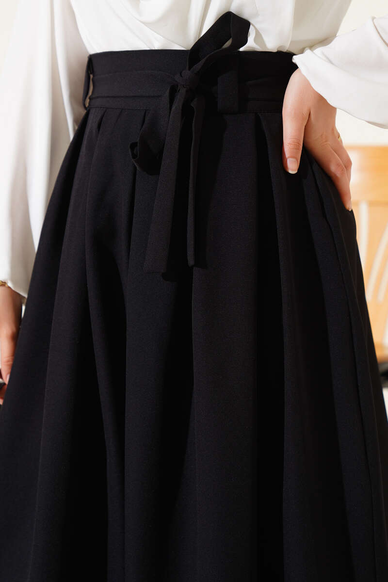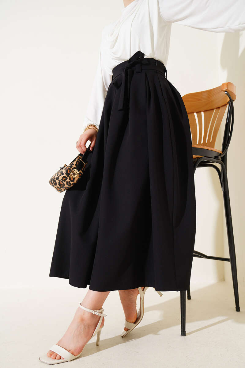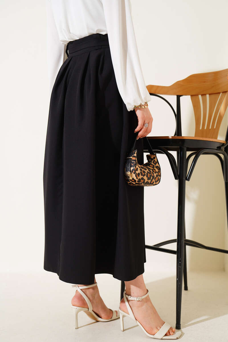 Düğme Detaylı Kemerli Deri Etek Siyah