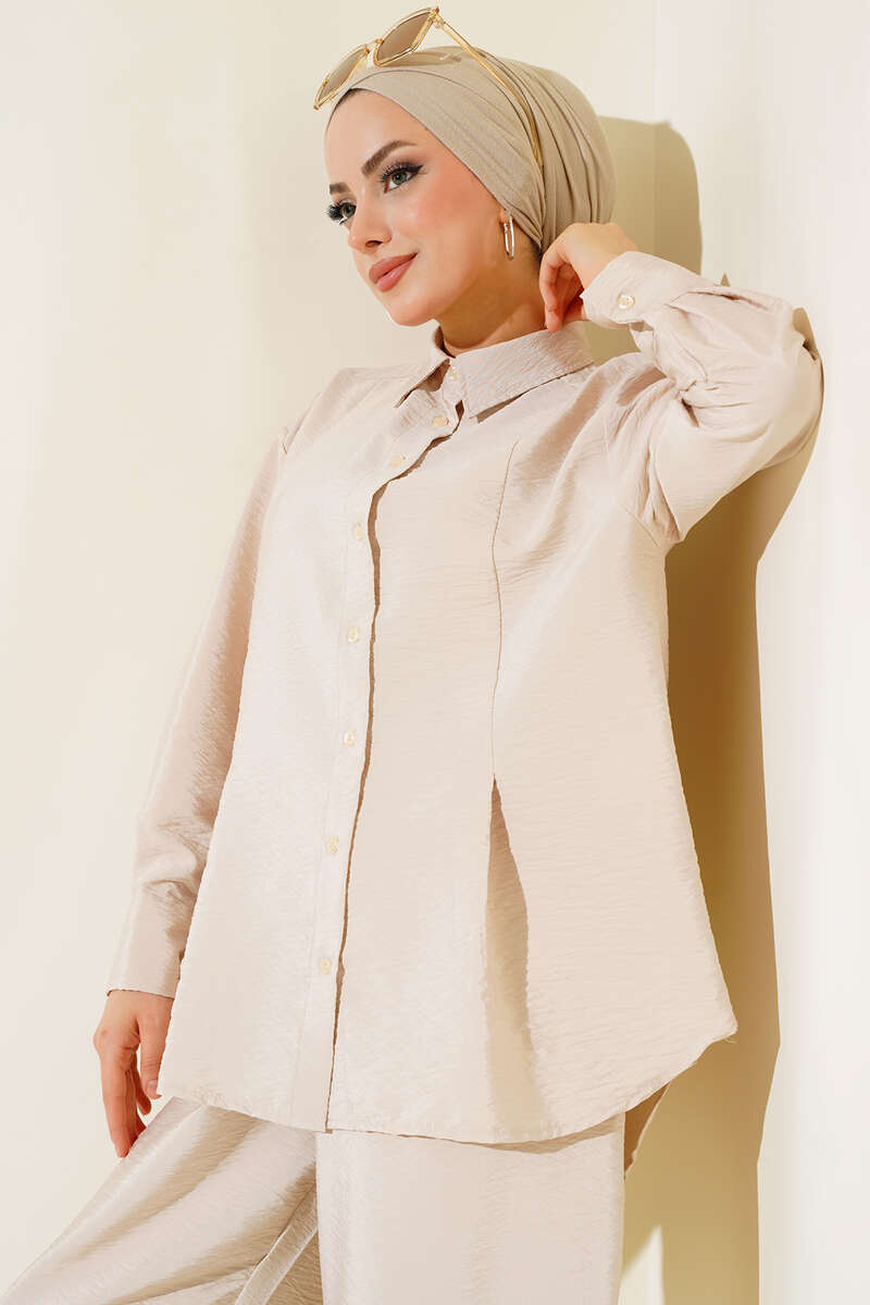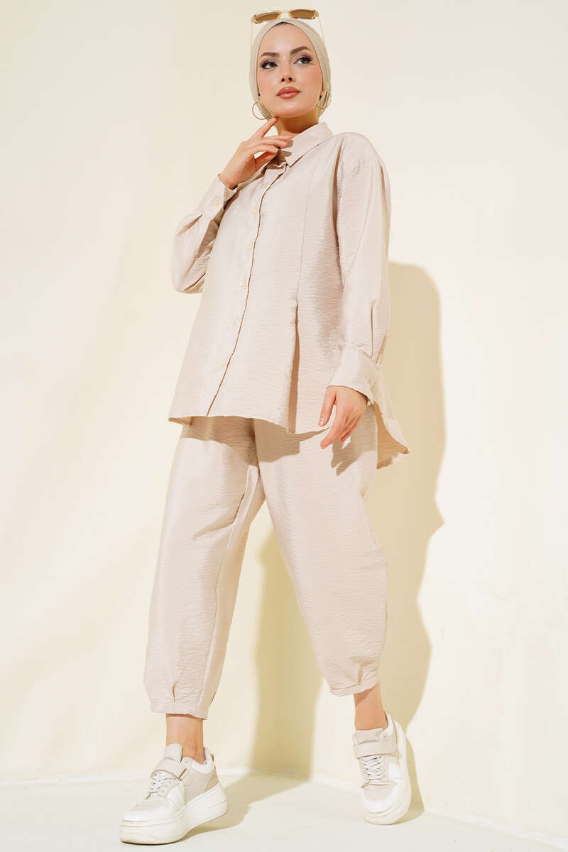 Yeni sezon ikili takımımız tunik ve pantolondan oluşmaktadır. Tuniğimiz boydan düğmelidir. Tuniğimizin önü kısa arkası uzun modeldir. Kol bilekleri geniş manşetli ve düğmelidir. Tuniğimizin önünde ve arkasında pilise detayı bulunmaktadır. Pantolonumuzun beli lastiklidir. İki adet cebi vardır. Şalvar pantolon modeldir. Sade ve şık olan ikili takımımız vazgeçilmeziniz olacak.