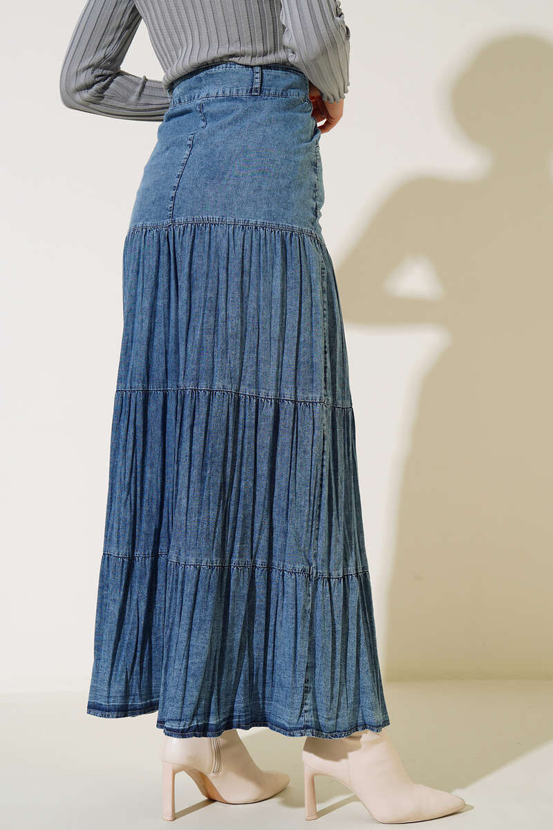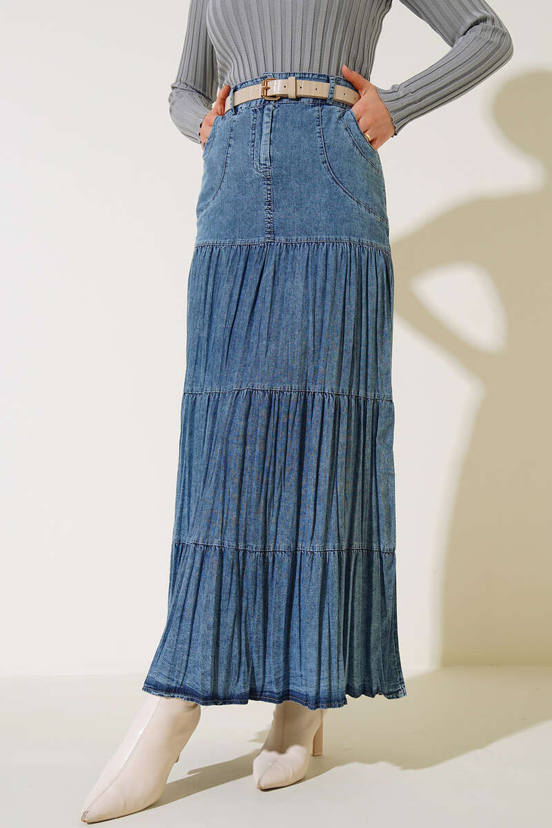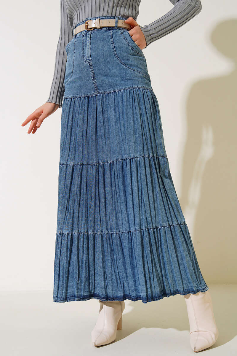 Yeni sezon kot eteğimiz favoriniz olacak. Eteğimizin dört adet kemer köprüsü bulunmaktadır. Ön tarafta iki adet cebi kullanılabilir. Eteğimiz fermuarlı olup belinde bir adet düğme bulunmaktadır. Pileli oluşu eteğimize şıklık katmaktadır.