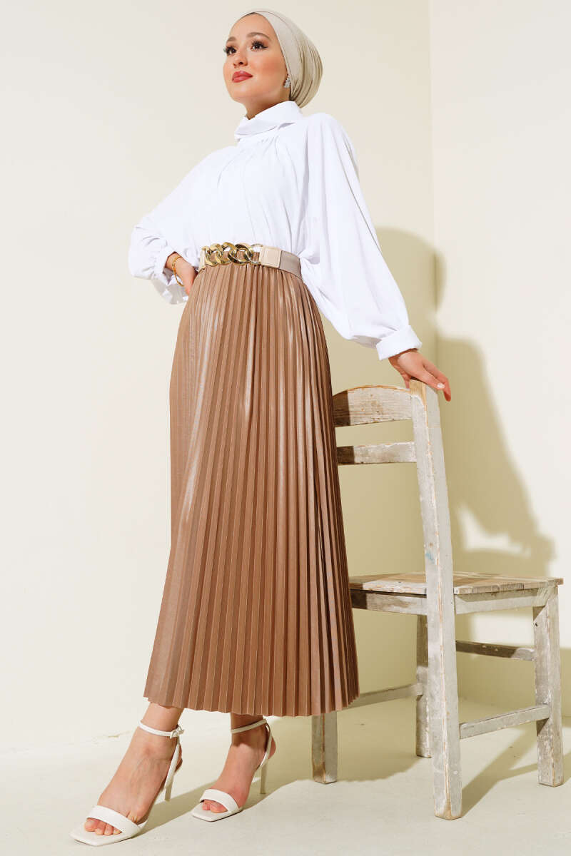Loyşa Bel Lastikli Kemerli Etek Kahve