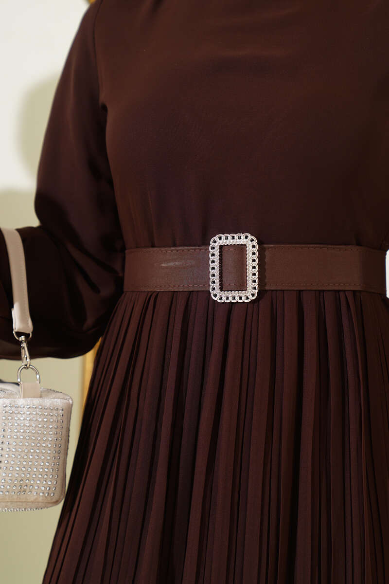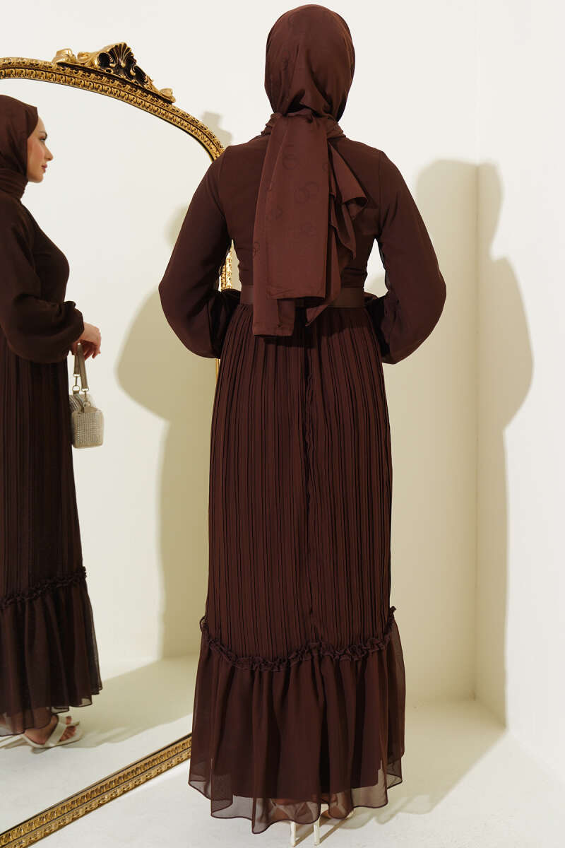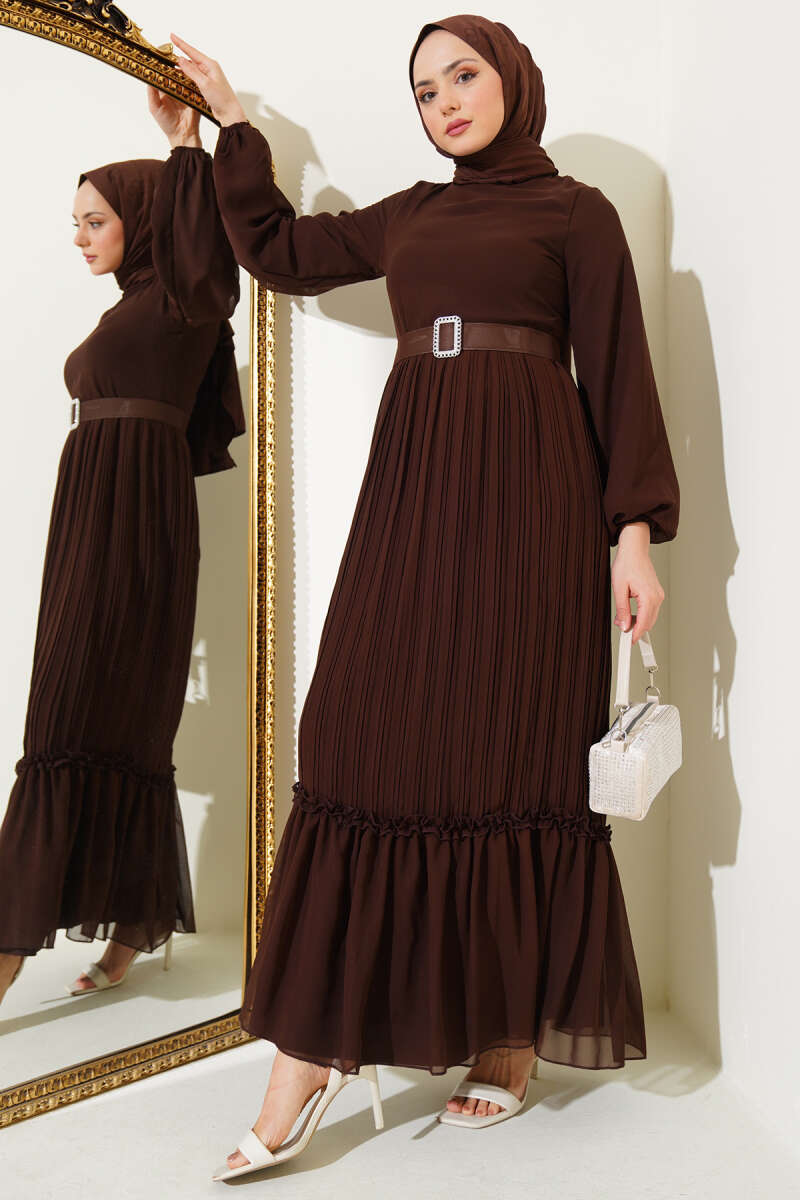 Bel Büzgü Detaylı Abiye Elbise Kahve