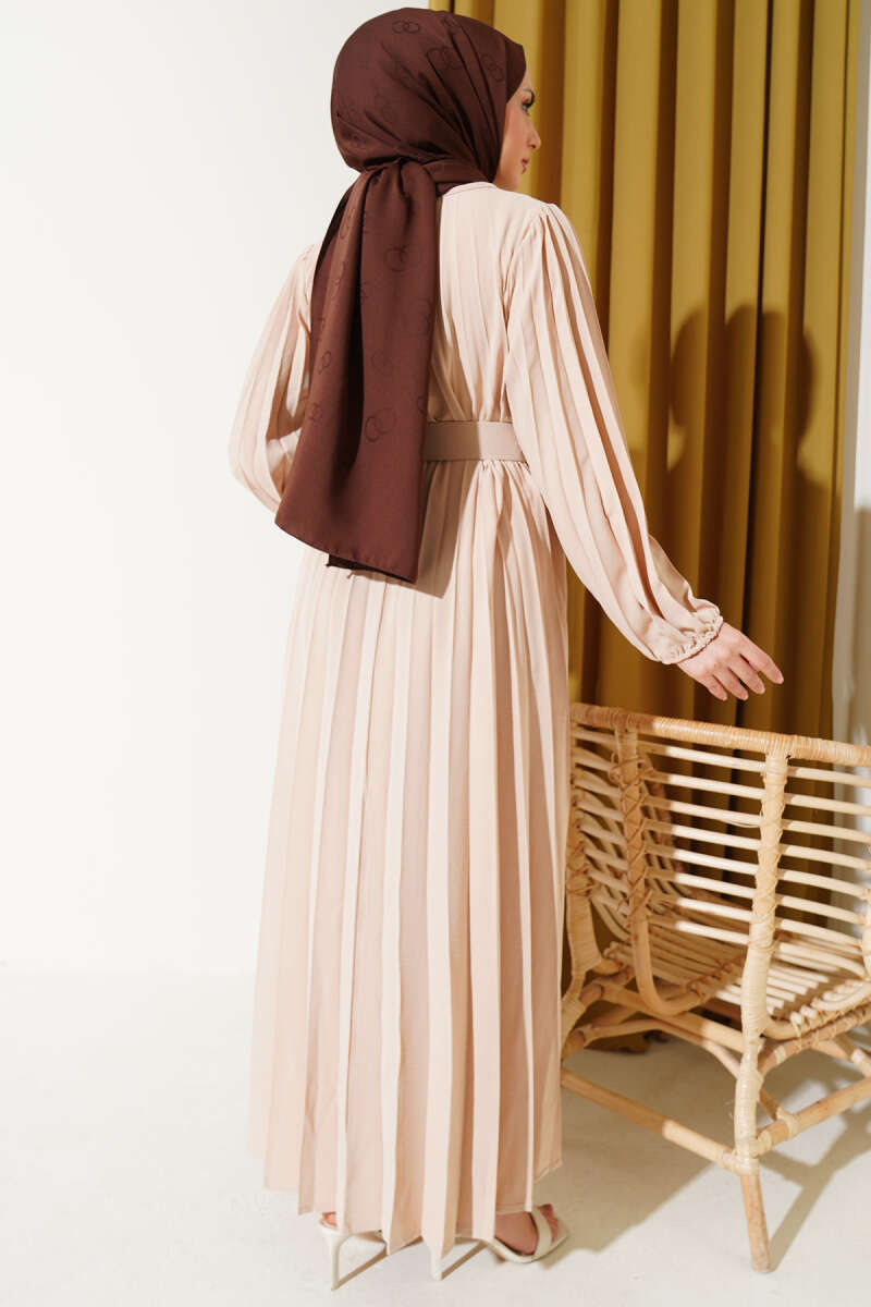 Çift İp Kuşaklı Ekoseli Elbise Bej