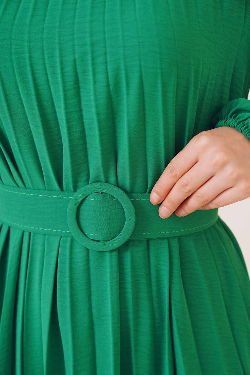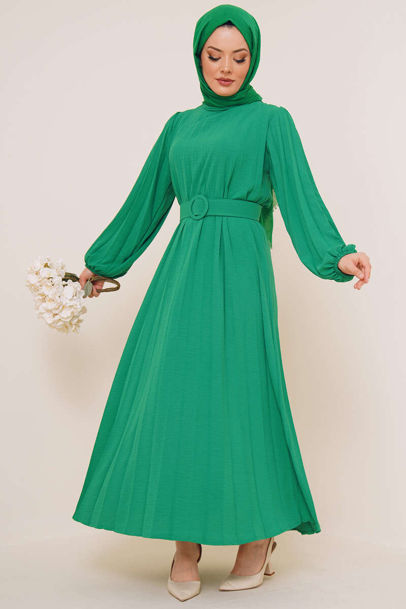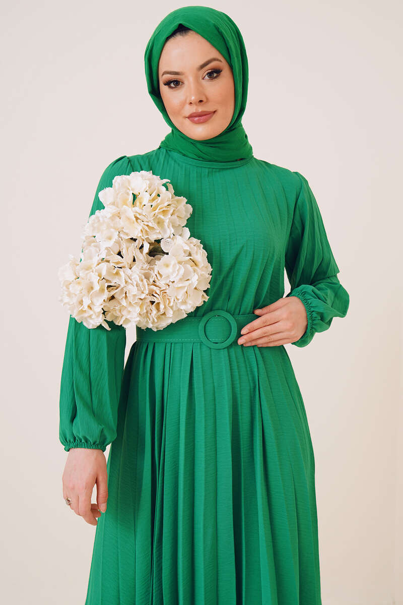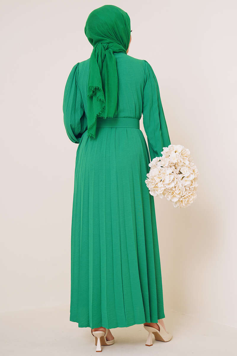 Ön ve arka kısmı omuzdan aşağı kadar piliselidir. Kemerlidir ve kolları lastiklidir. İç göstermez. Bisiklet yakalı piliseli elbisemiz günlük hayatınıza bile şıklık katar.
