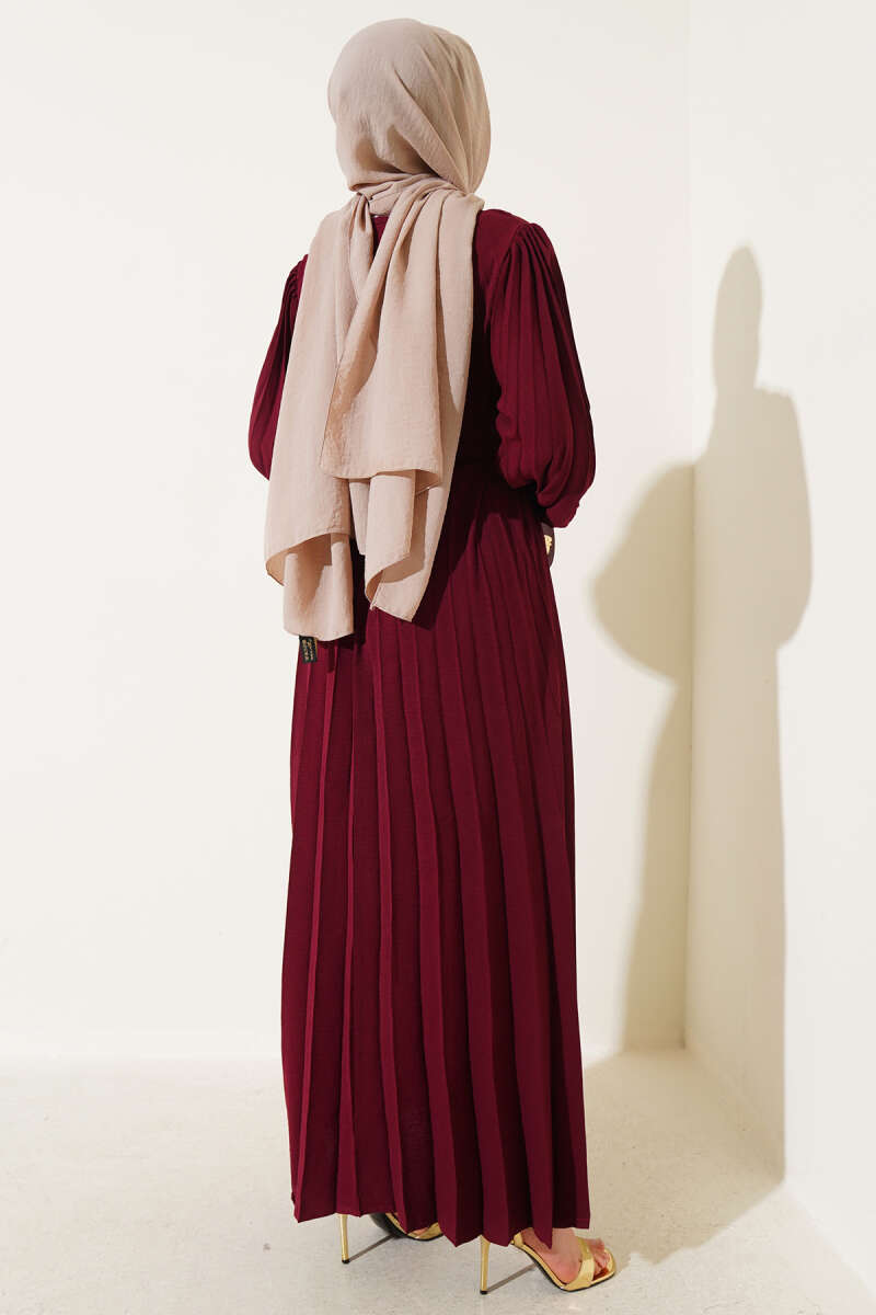 Piliseli Kemerli Ayrobin Elbise Bordo