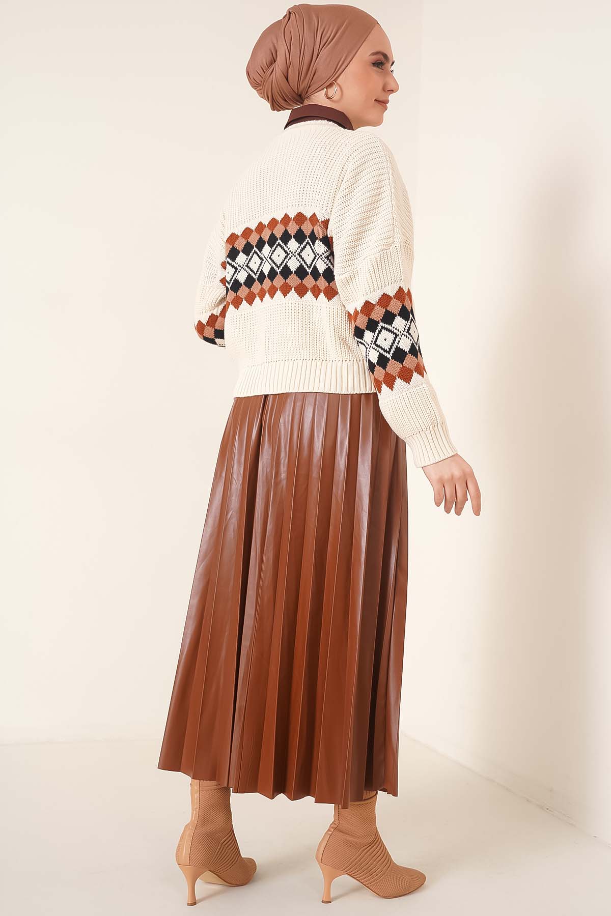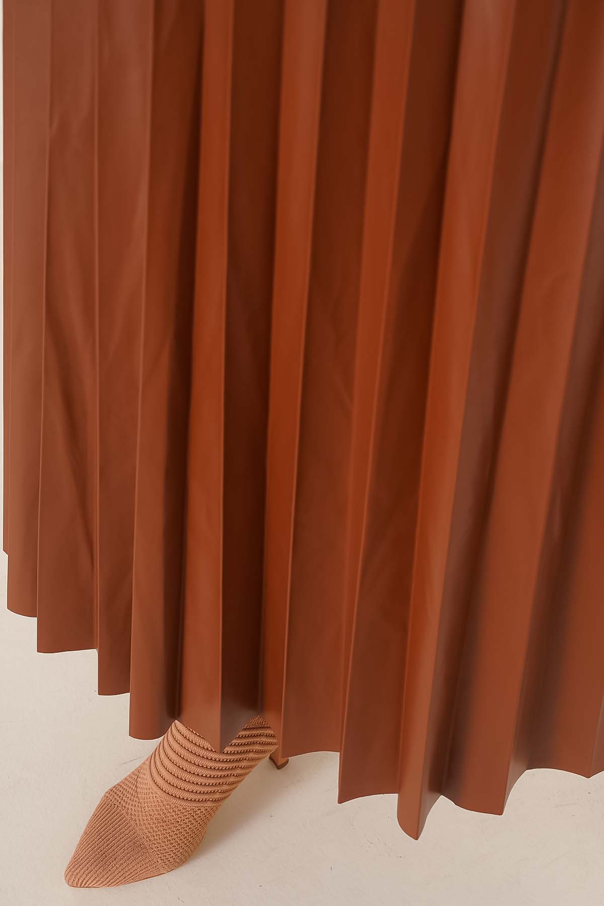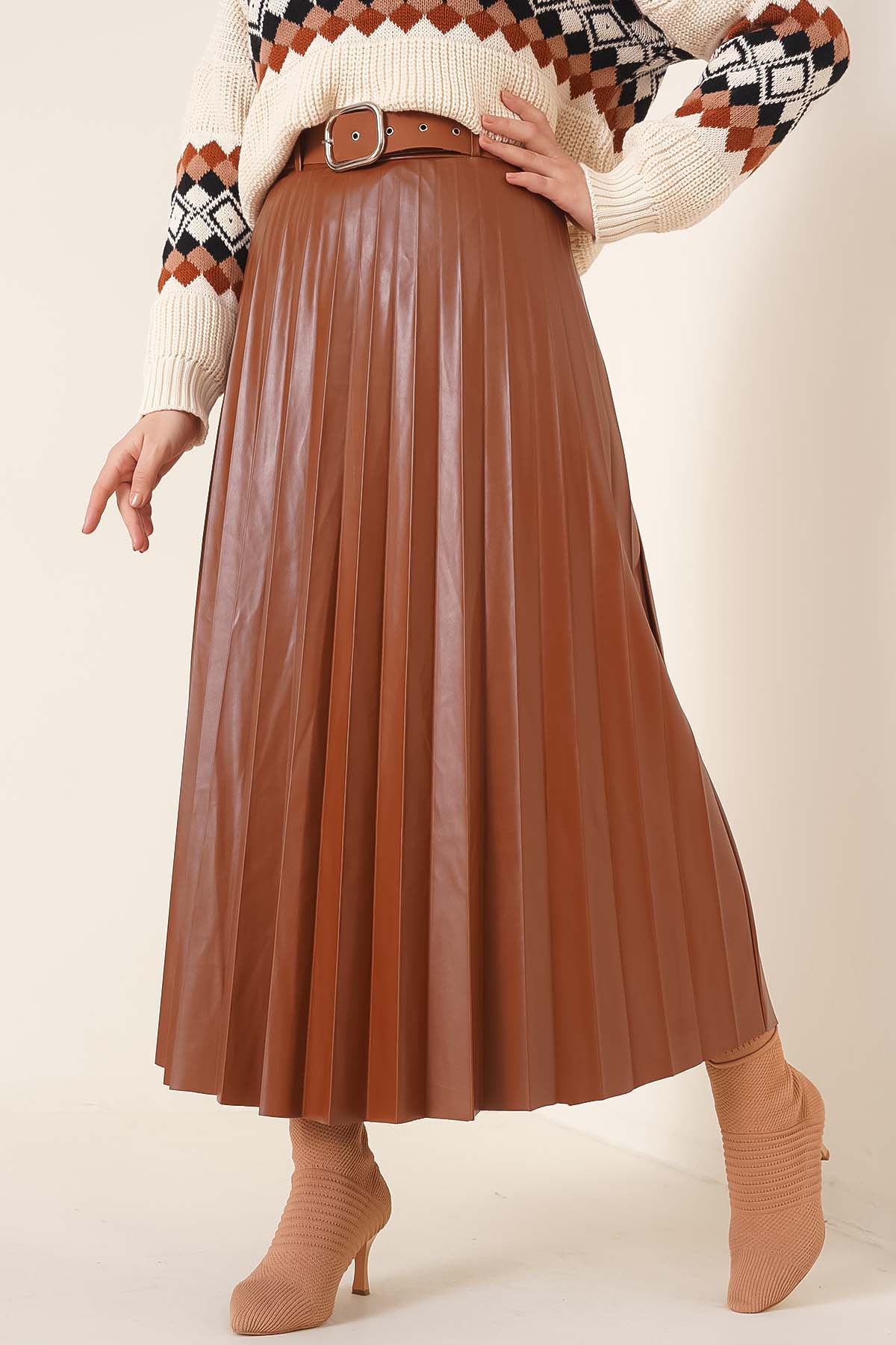Piliseli etek yeni sezon modeldir. Beli lastiklidir. Taba deri eteğe kemer dahildir. Beş adet kemer köprüsü vardır. Astarsızdır, iç göstermez. Renk seçeneği vardır.