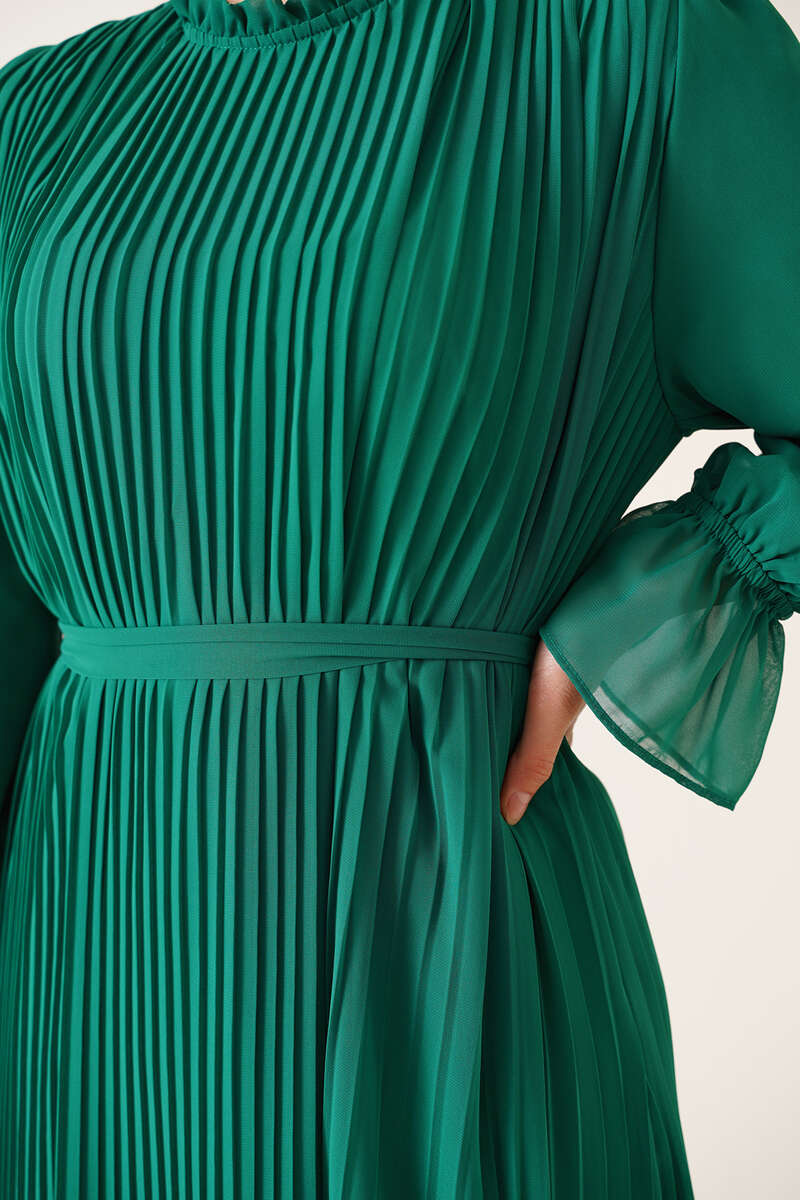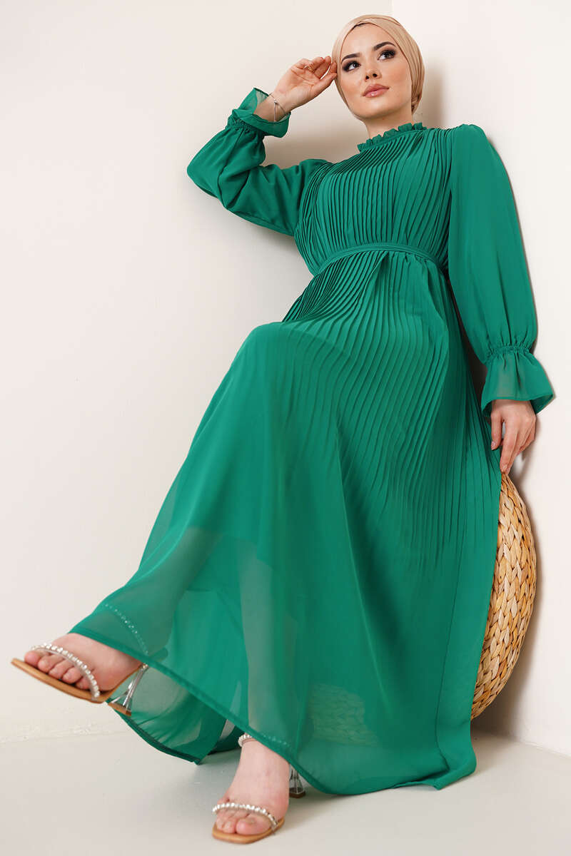 Ürün BilgisiModelin üzerindeki ürün - S - bedendir.Boy: 131 cmGöğüs: 94 cmBel: 94 cmYeni sezon şifon elbisemiz piliselidir. Yakası fırfır detaylı olan elbisemizin ense düğmesi bulunmaktadır. Bilekleri lastik detaylıdır. Beli kuaşaklı olan elbisemizin içi astarlıdır.Kumaş Bilgisi%100 PolyesterModel BilgisiBoy: 160 cmGöğüs: 86 cmBel: 69 cmKalça: 89 cm