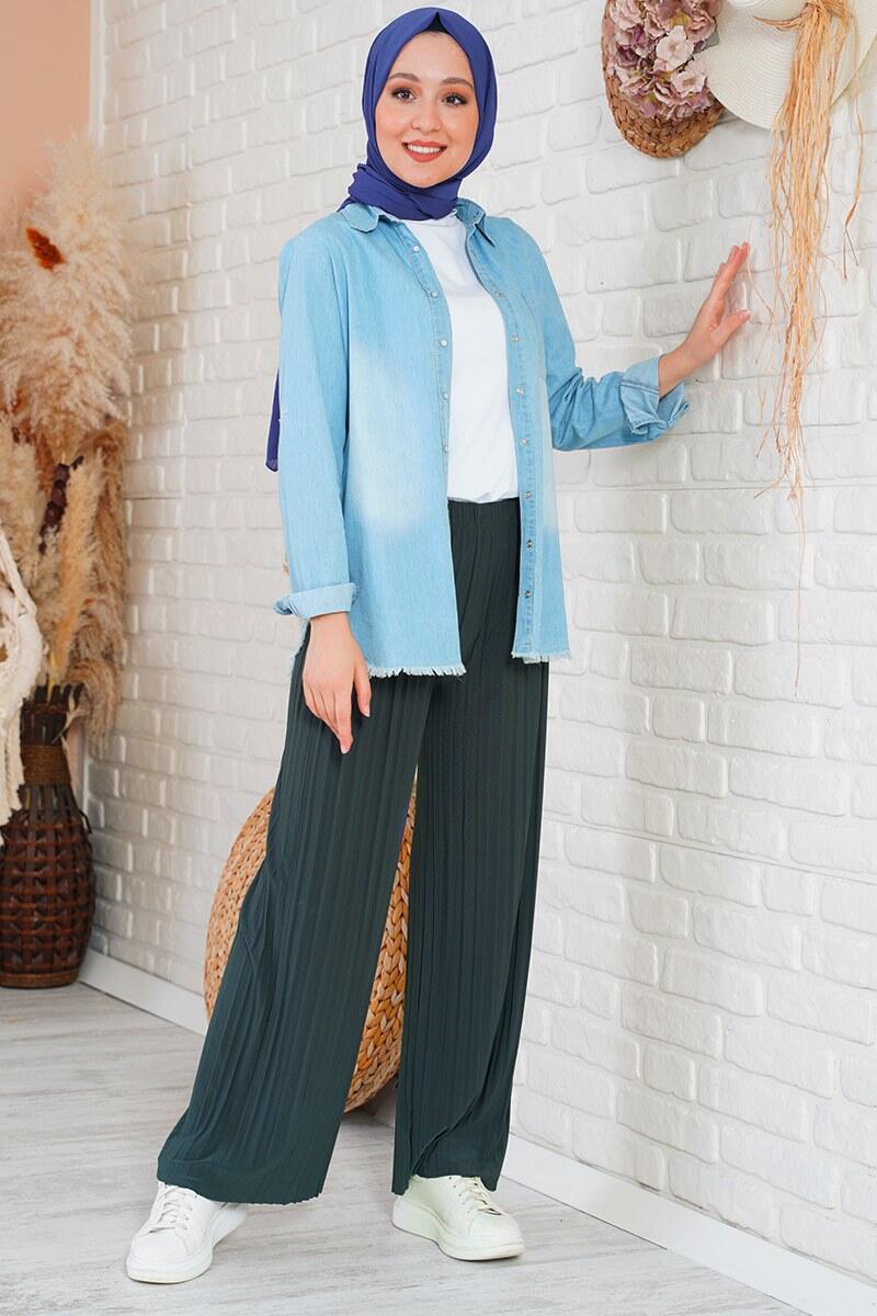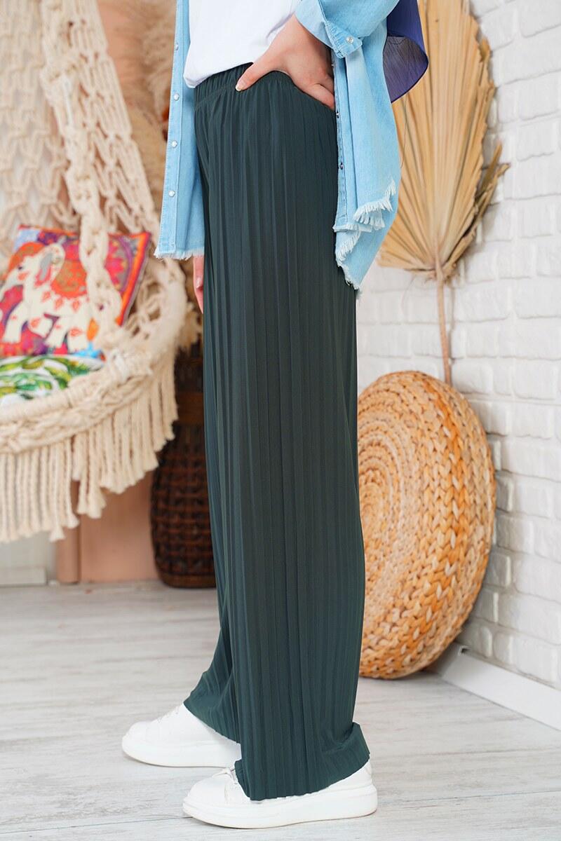 Salaş kesim piliseli pantolon yeni sezon modeldir. Füme renkli bol paça pantolonun beli lastiklidir. Rahat yapısıyla tüm gün konforunuzu koruyacağınız pantolon iç göstermemektedir. Paçaları lazer kesimlidir. Geniş renk skalası bulunan pantolonda düğme ve fermuar bulunmamaktadır.