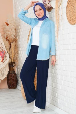 Yeni sezon lacivert piliseli pantolonu çok seveceksiniz. Beli kalın lastikli olan pantolonla yaz ayını efil efil geçireceksiniz. Paça kısımları lazer kesimli olan pantolonda fermuar ve düğme bulunmamaktadır. Geniş renk skalasıyla her zevke hitap etmektedir. Astarsız olan pantolon iç göstermeyen kumaşa sahiptir.