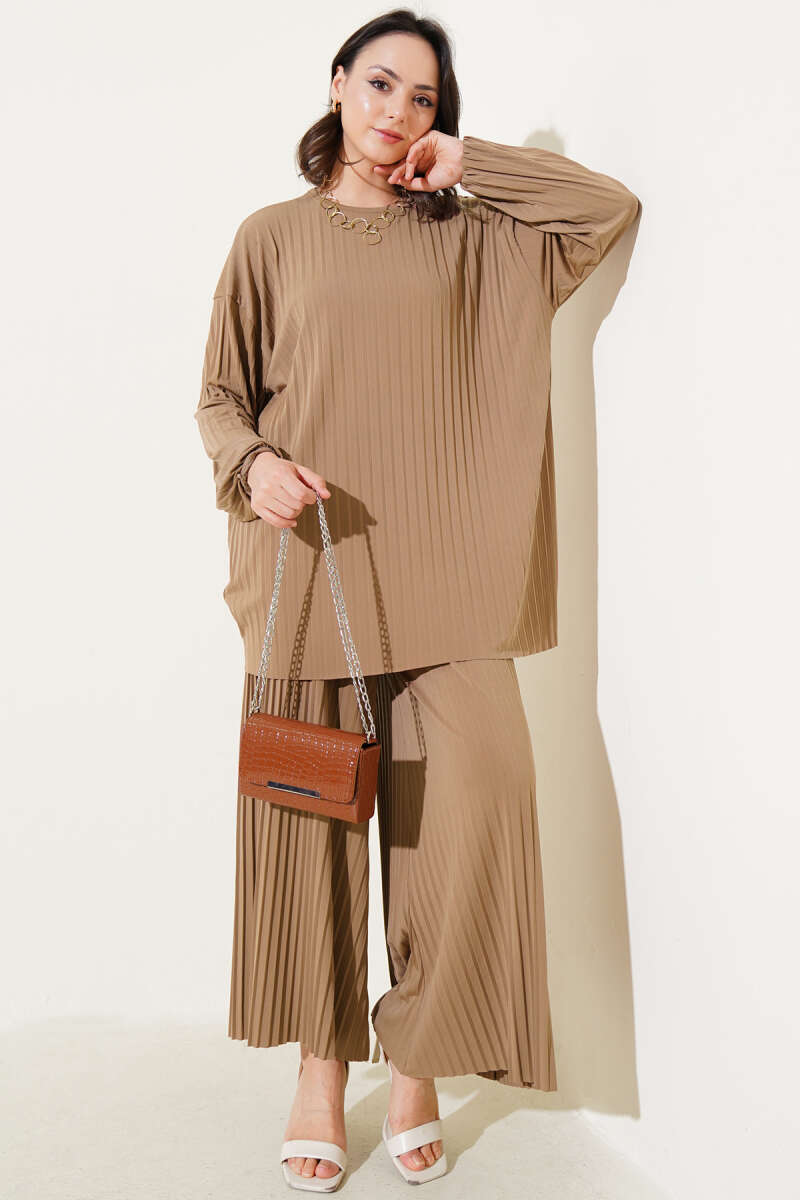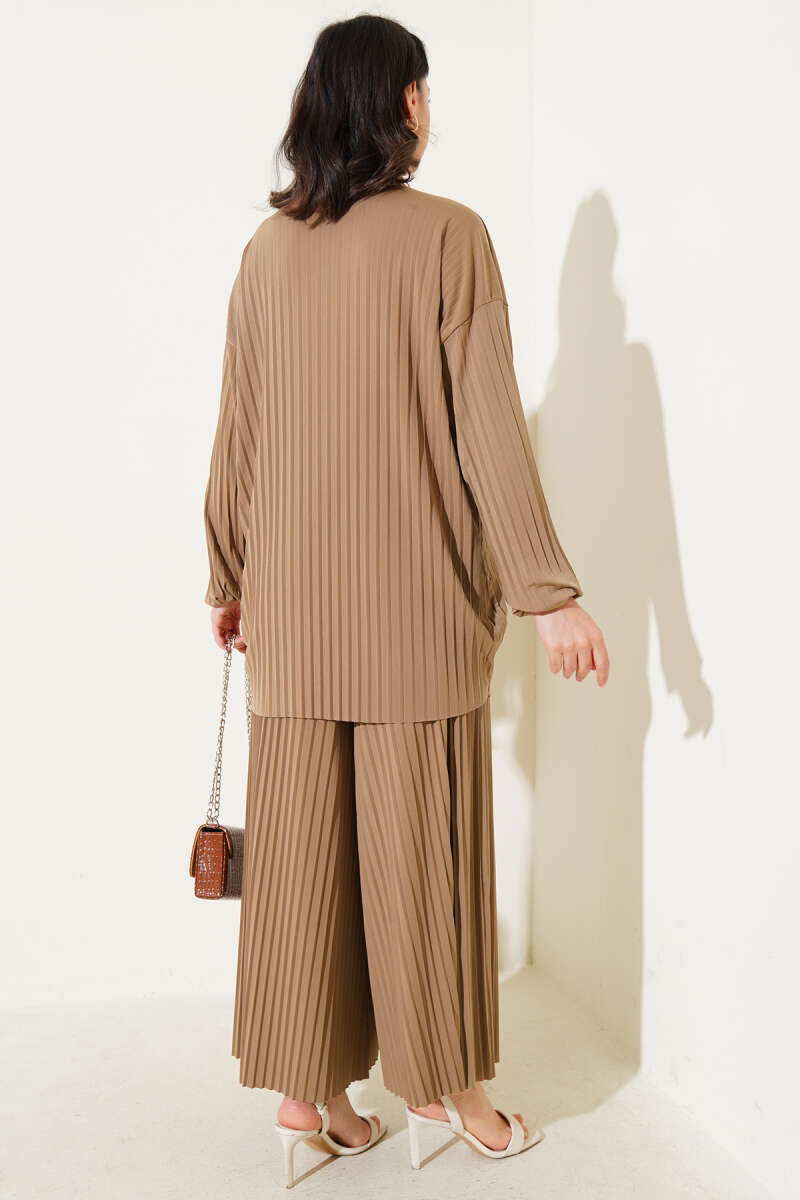 Asimetrik Kesim Bisiklet Yaka İkili Takım Kahve