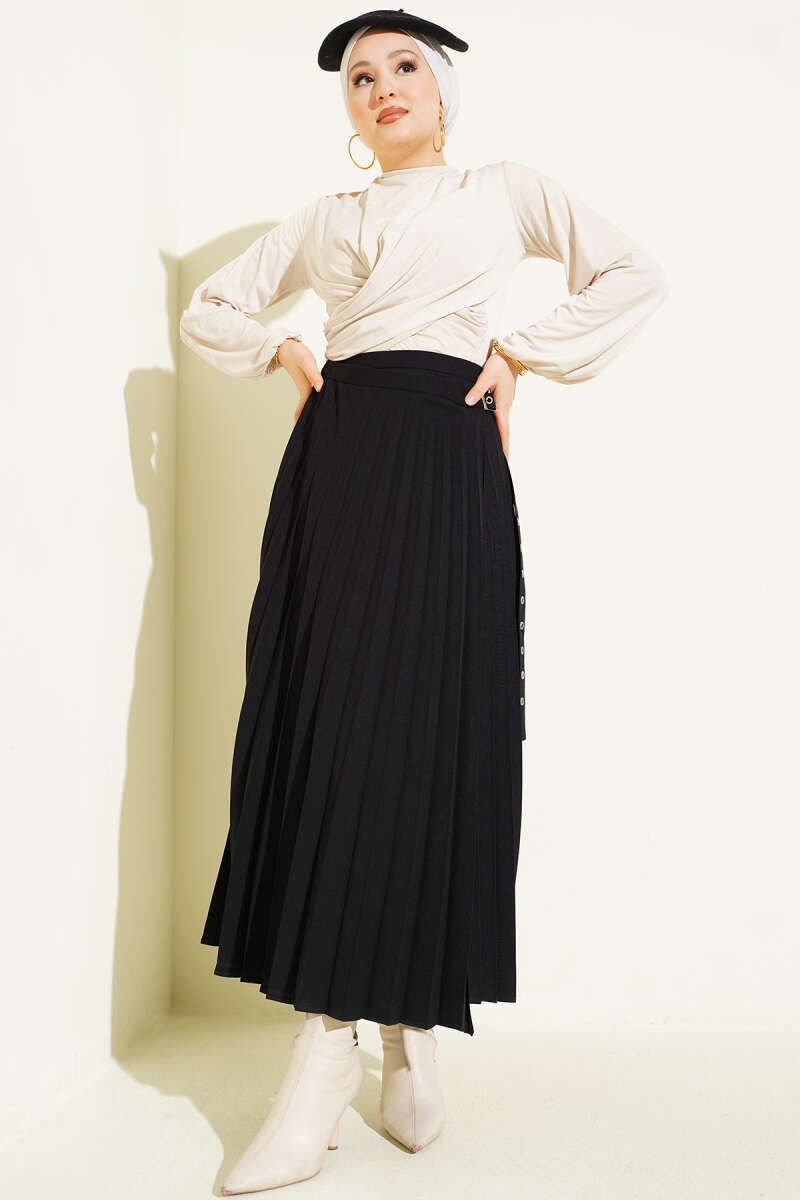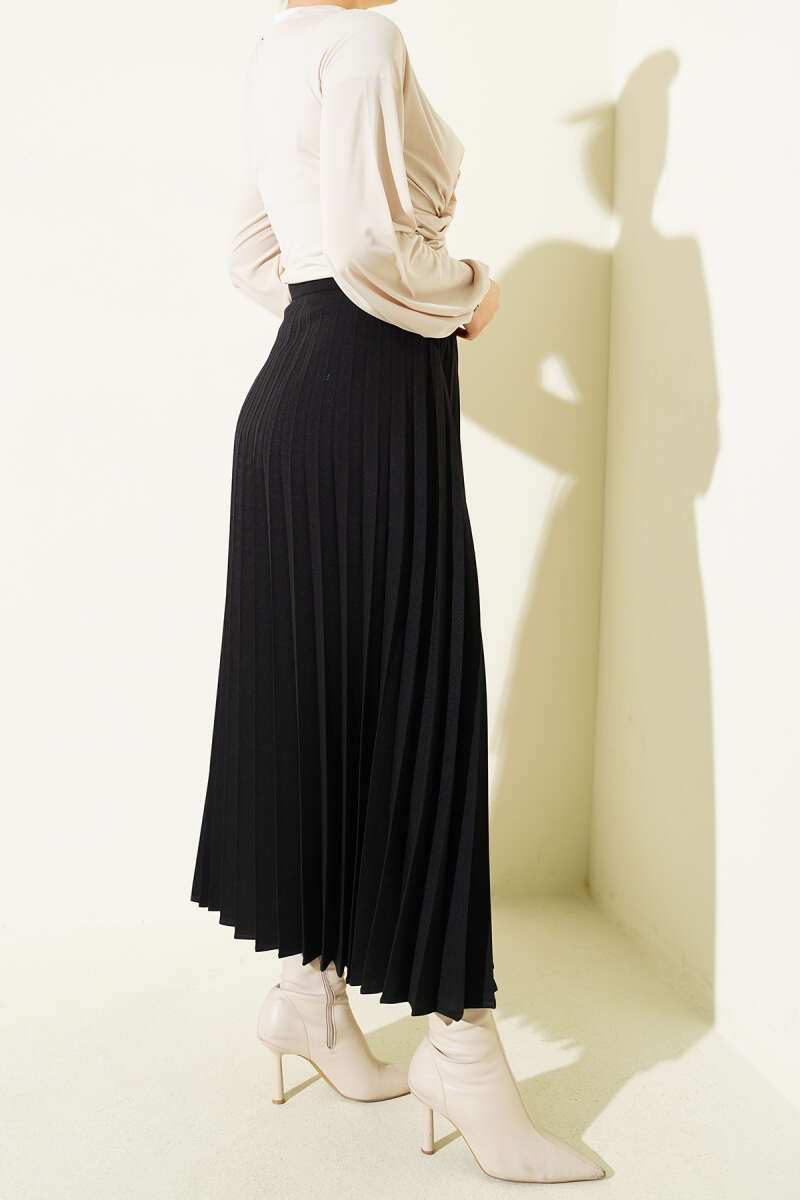 Kemerli Pileli Kloş Etek Siyah