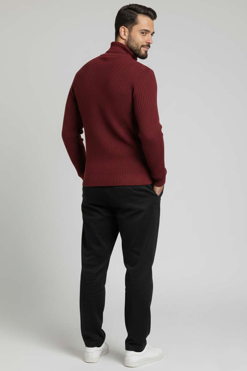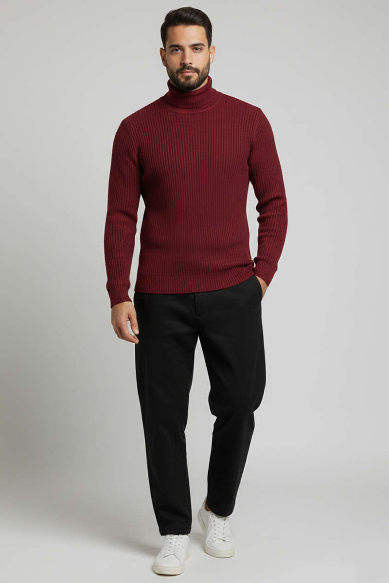 Pirinç Örgü Balıkçı Yaka Erkek Kazak Bordo