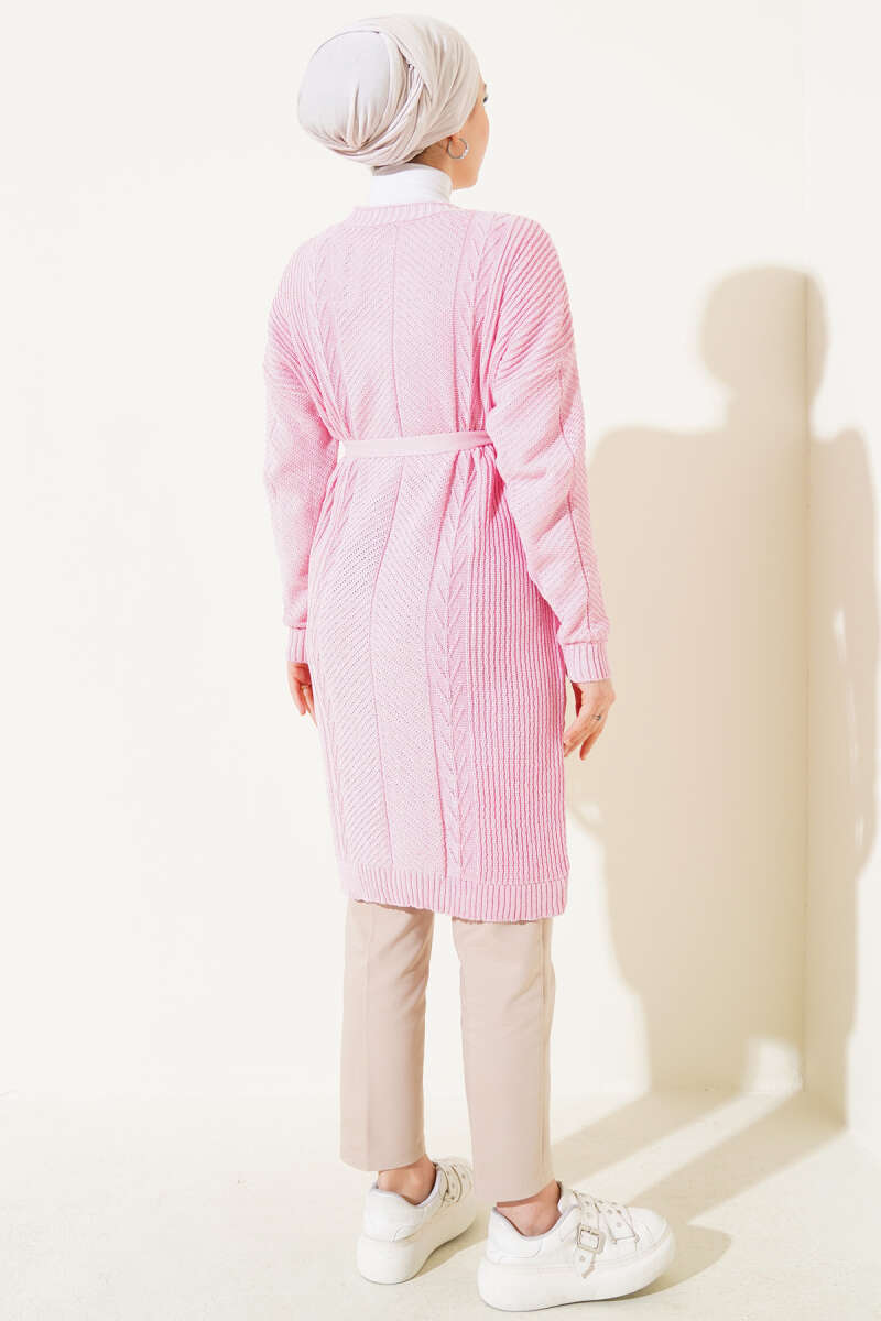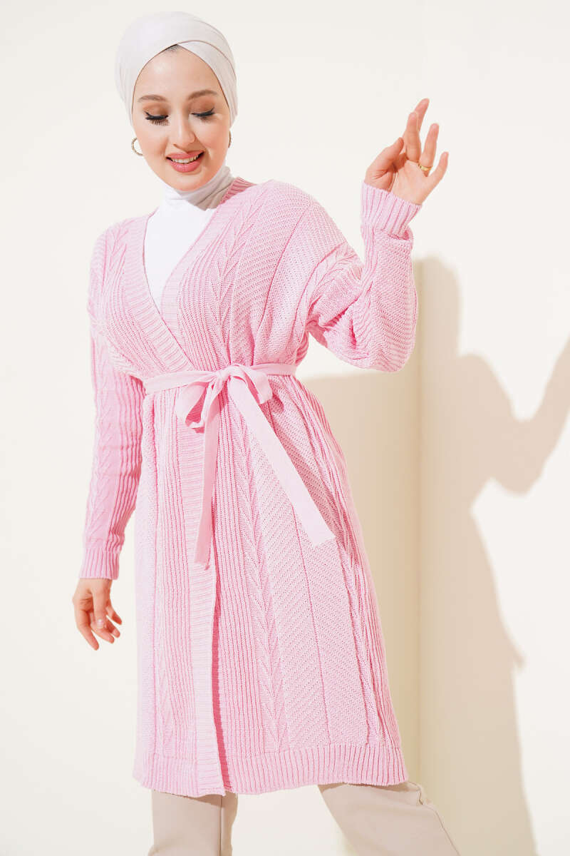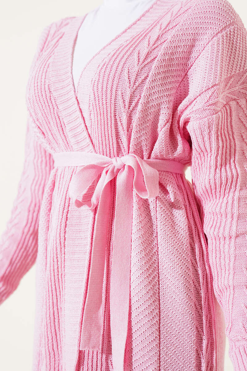 Pirinç Örgü Desenli Kuşaklı Triko Hırka Mavi