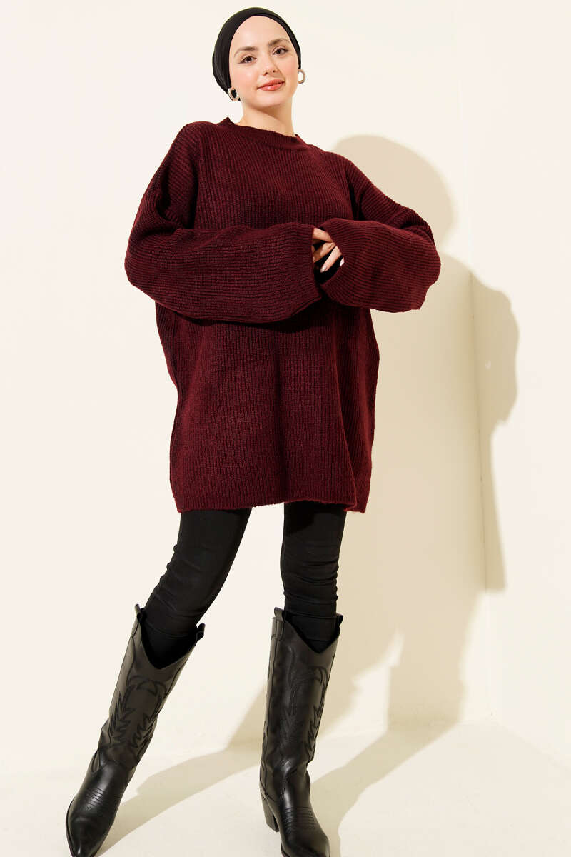 Gömlek Yaka Çizgili Triko Tunik Bordo