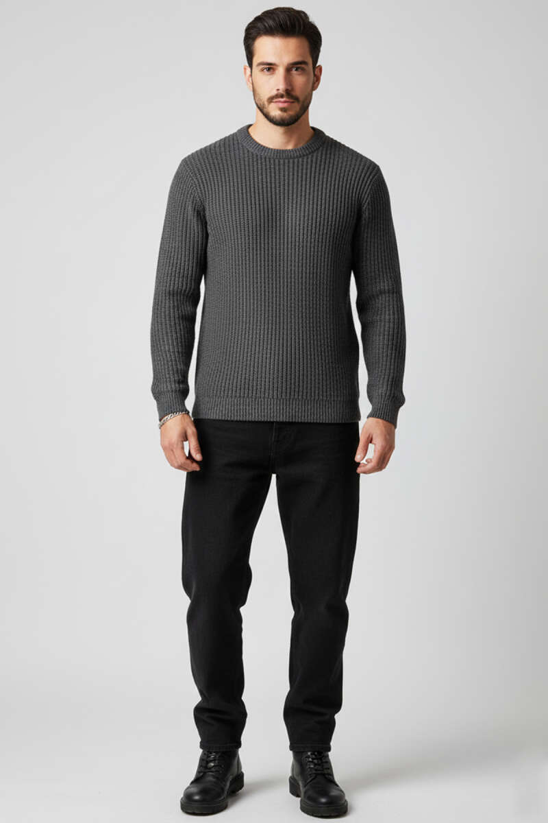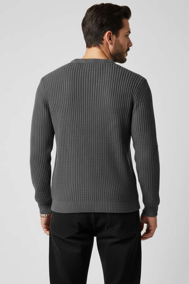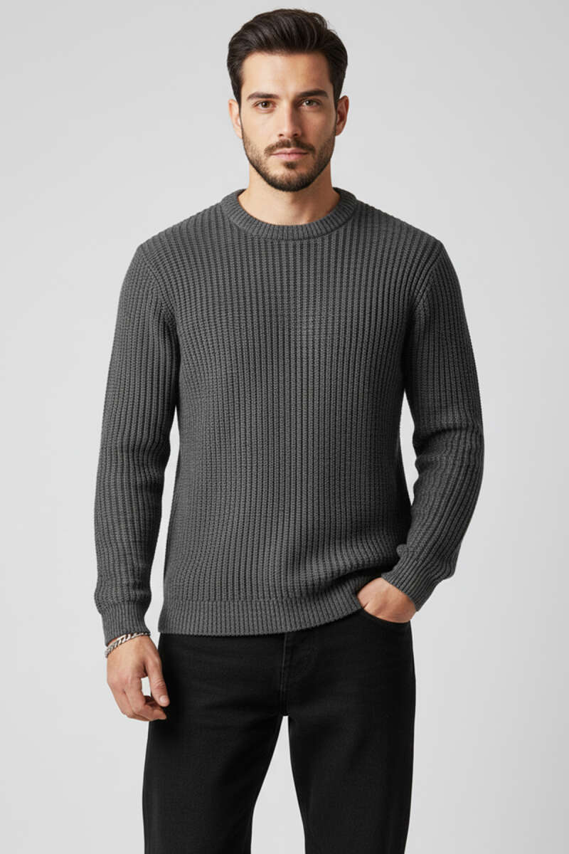Dikey Çizgi Fitilli Erkek Triko Kazak Gri