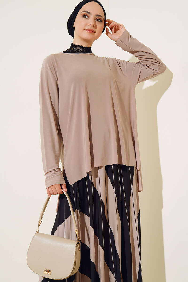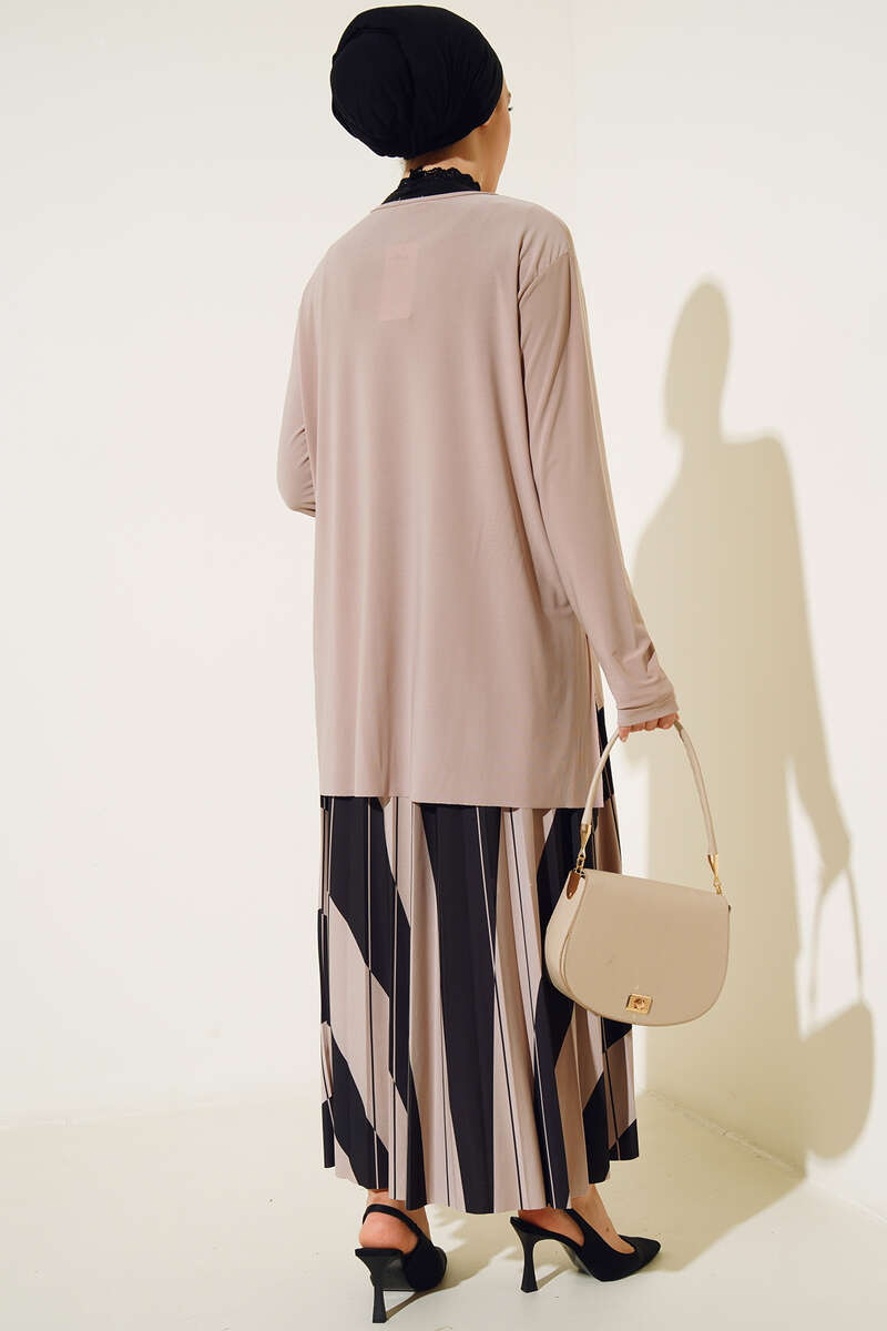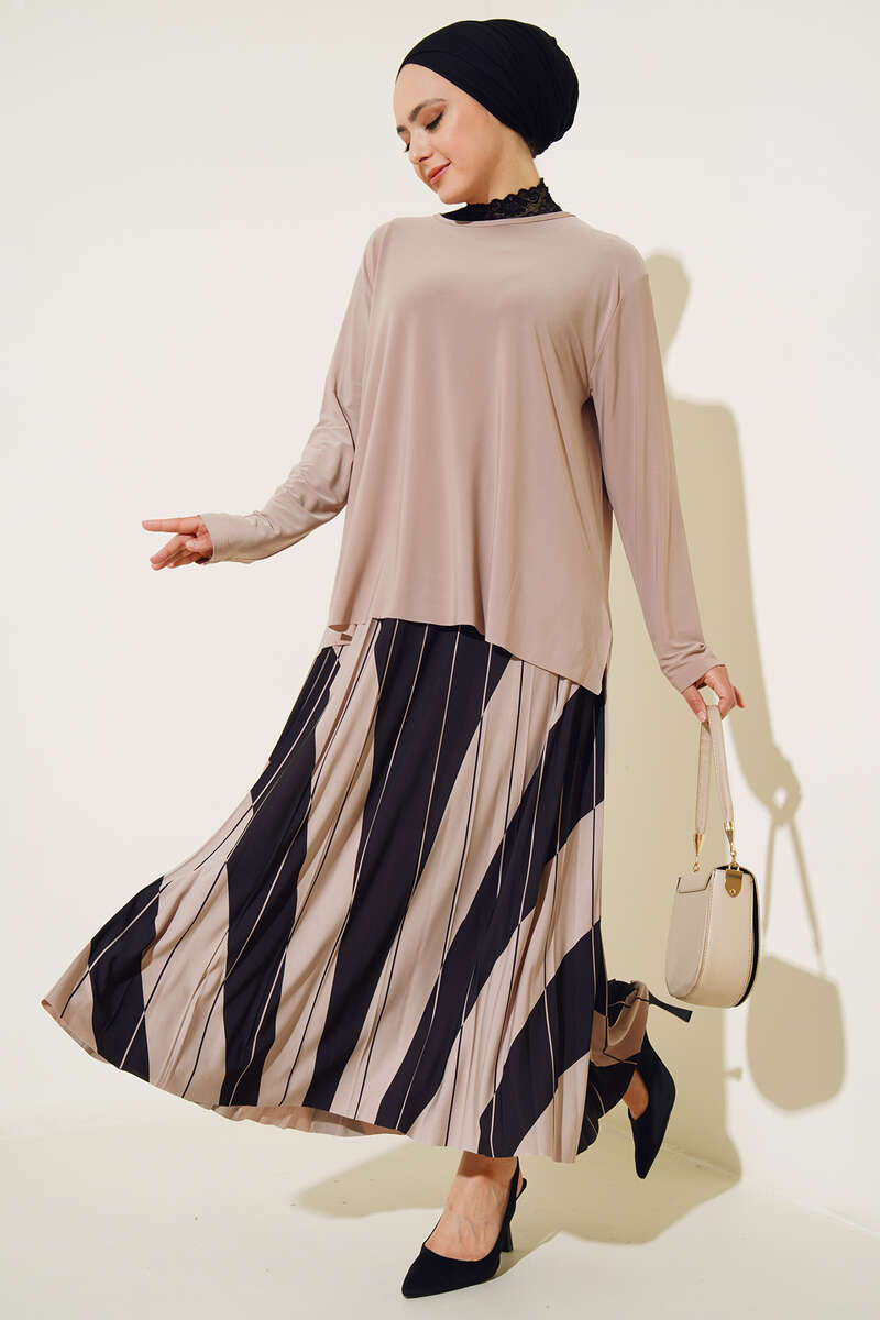 Yeni sezon tunik etek ikili takımımız çizgi desenleriyle farkını ortaya koymaktadır. Tuniğimiz oval yakadır. Yanları yırtmaçlıdır. Tuniğimizin önü arkasına göre kısadır.