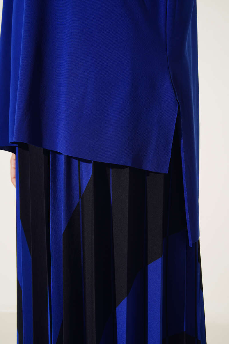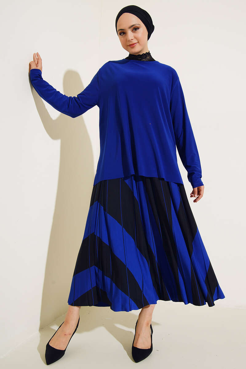 Pliseli Çapraz Çizgi Desenli Etekli Takım Saks