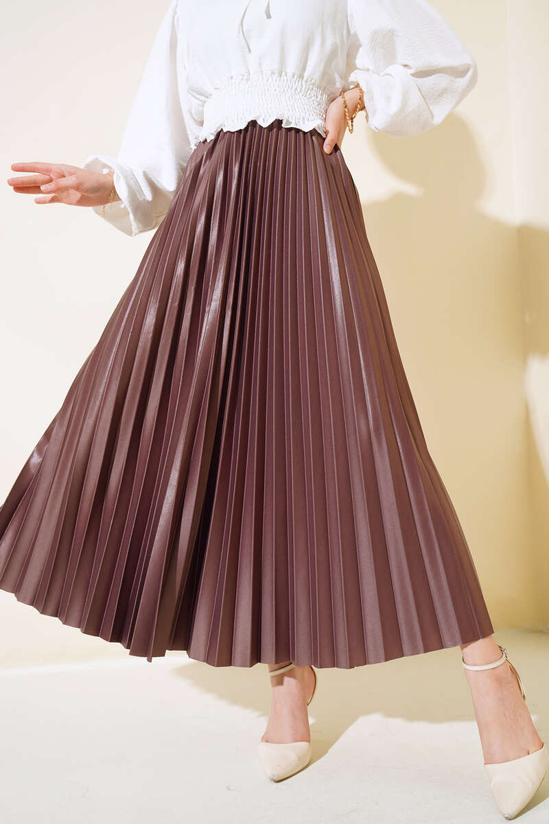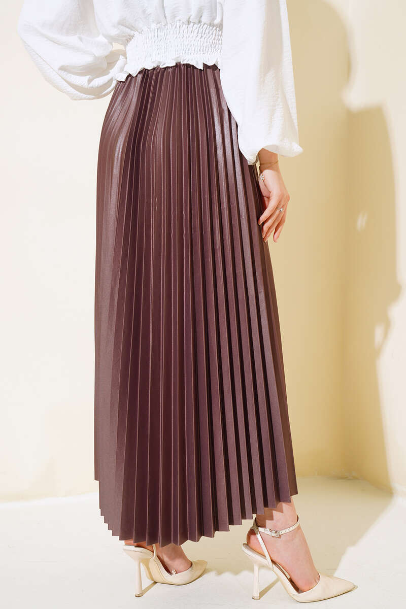 Yeni sezon pliseli eteğimiz deri görünümlü parlak kumaşıyla dikkat çekmektedir. Eteğimizin bel kısmı lastiklidir. Renk seçenekleri mevcuttur.