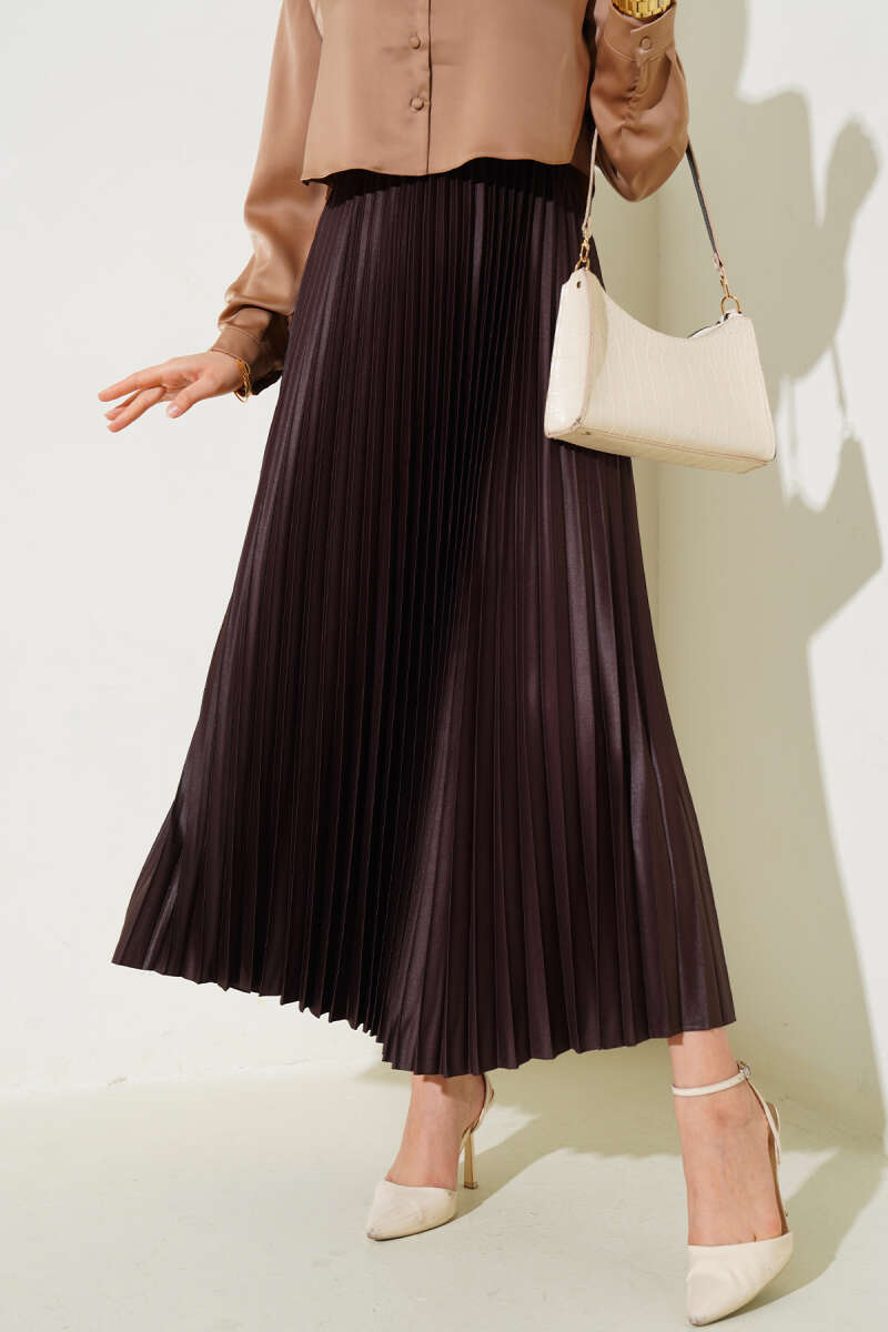Yeni sezon pliseli eteğimiz deri görünümlü parlak kumaşıyla dikkat çekmektedir. Eteğimizin bel kısmı lastiklidir. Renk seçenekleri mevcuttur.
