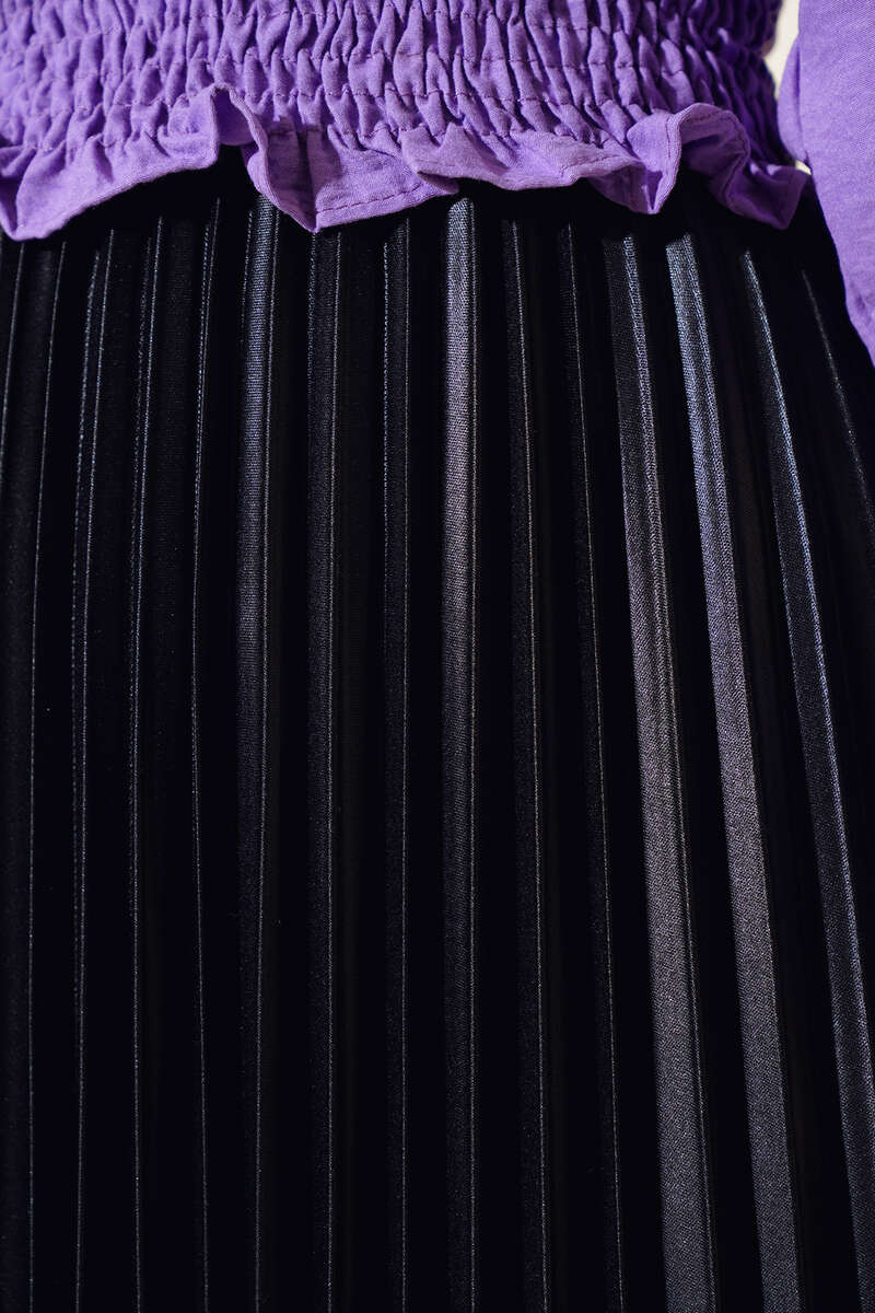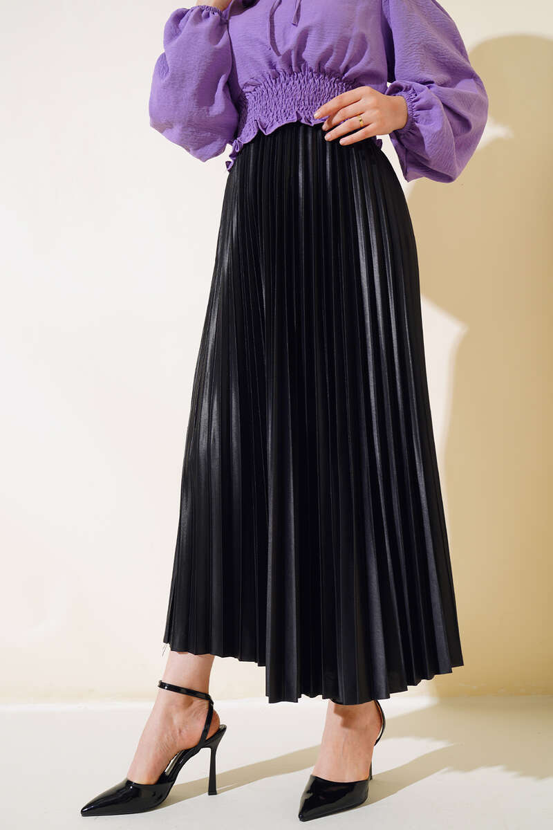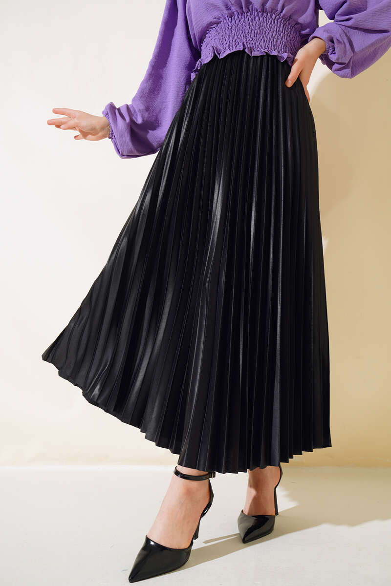 Yeni sezon pliseli eteğimiz deri görünümlü parlak kumaşıyla dikkat çekmektedir. Eteğimizin bel kısmı lastiklidir. Renk seçenekleri mevcuttur.