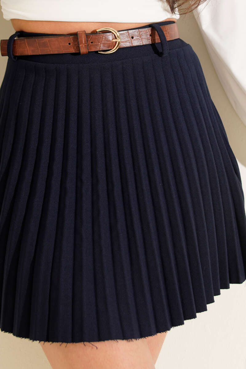 Pliseli Kemerli Mini Etek Lacivert