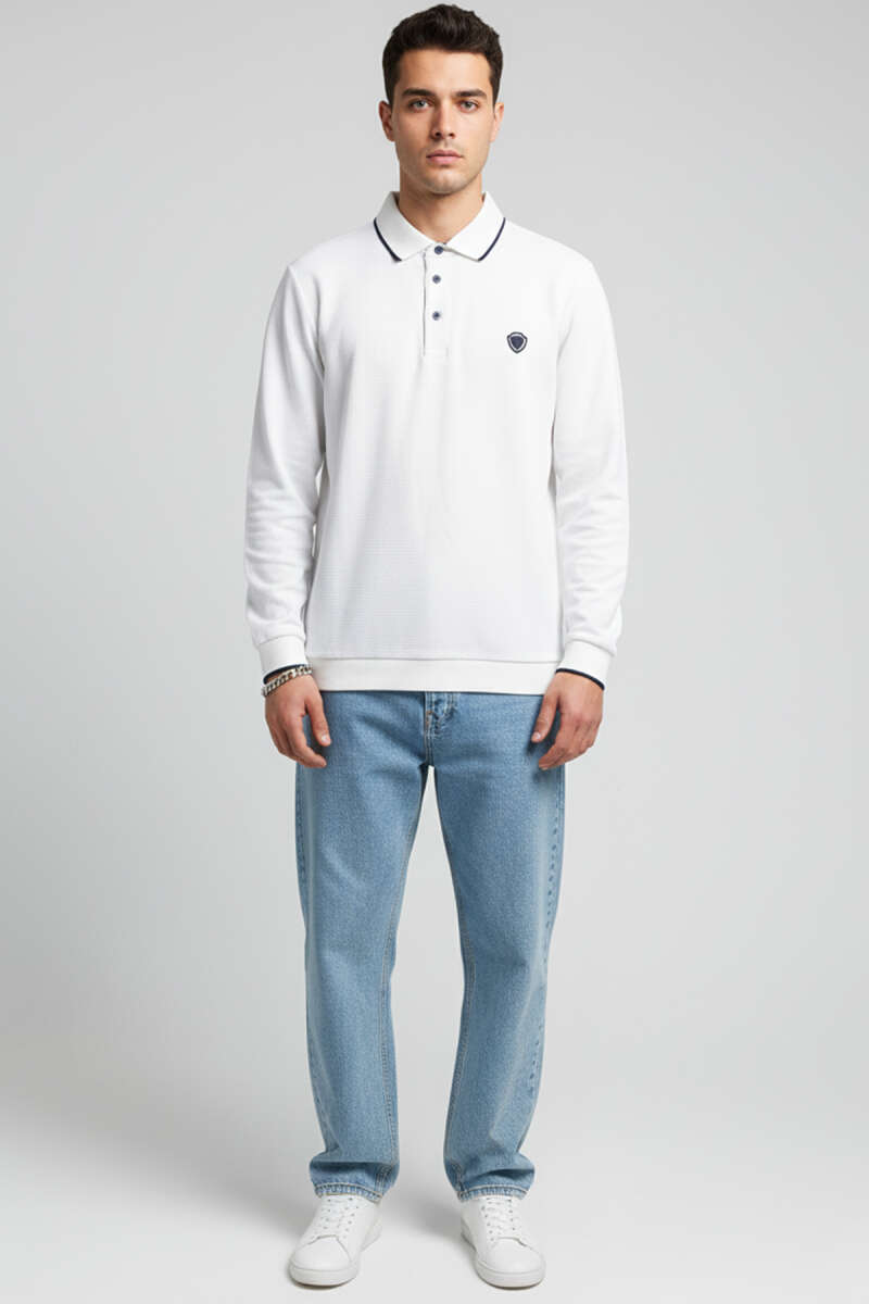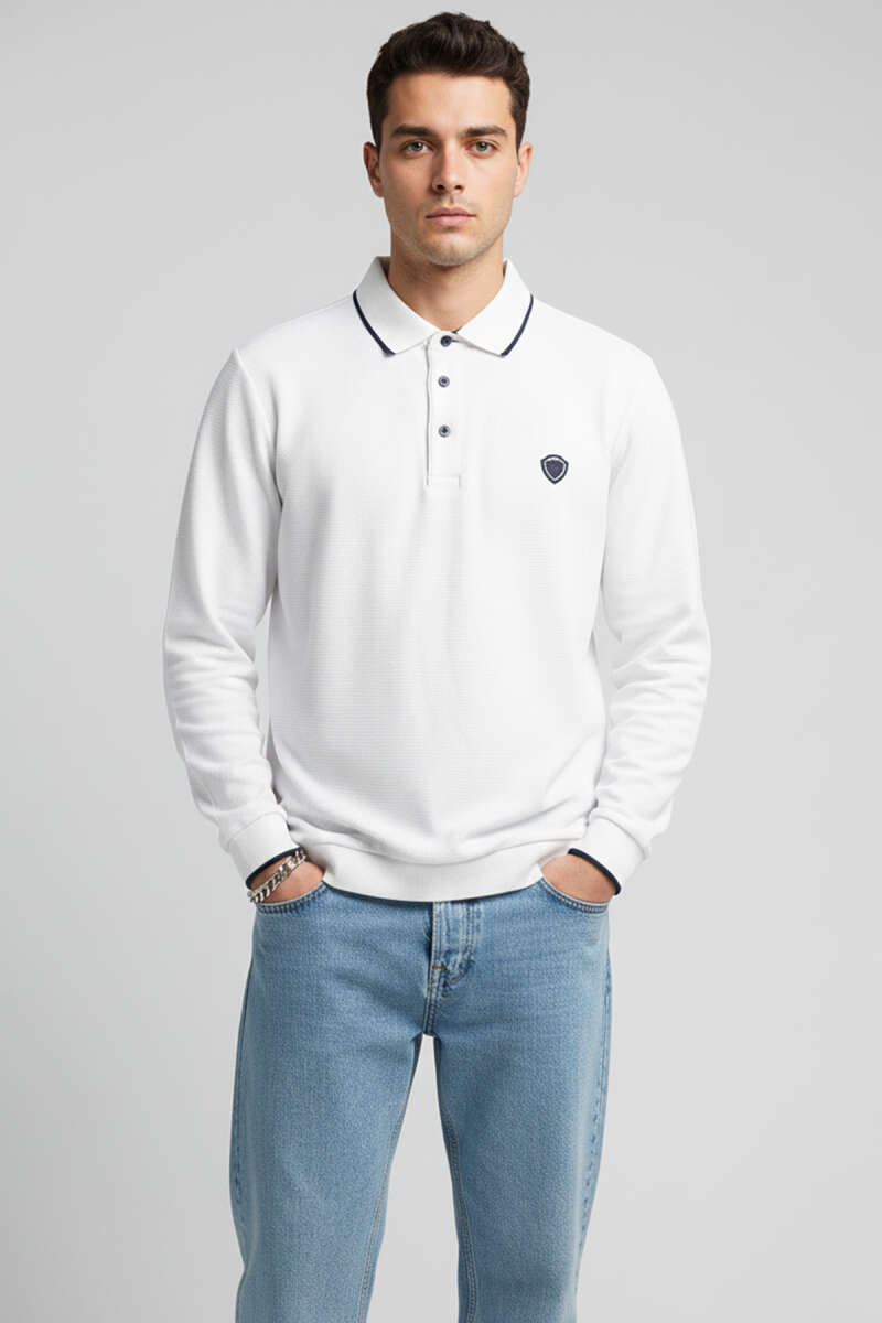 Polo Yaka Armalı Waffle Sweatshirt Beyaz