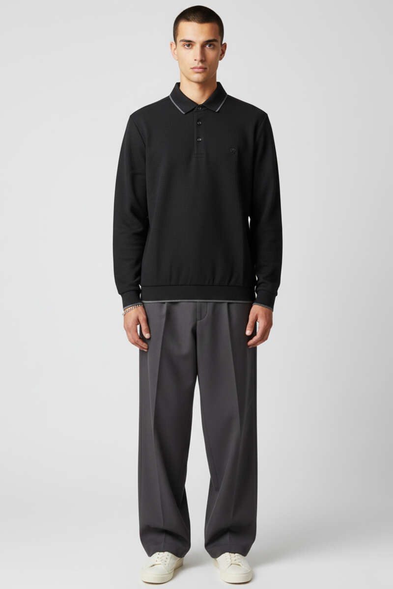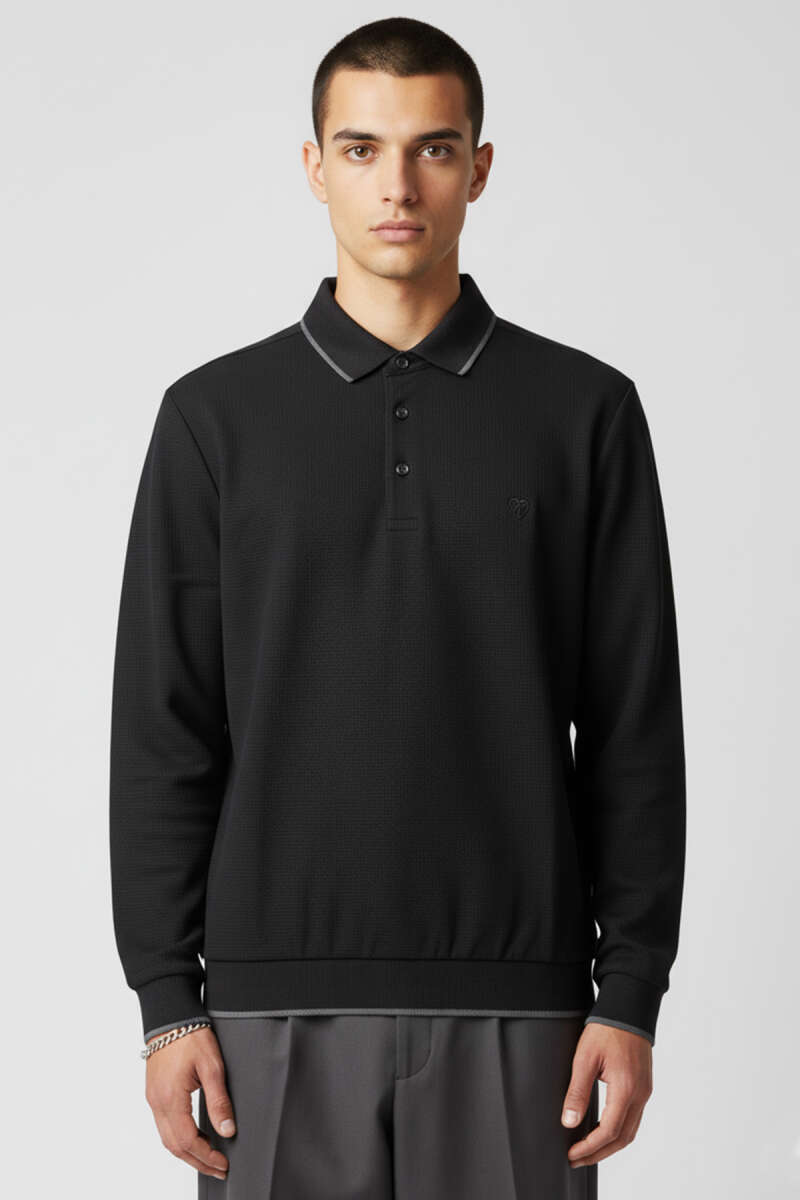 Polo Yaka Armalı Waffle Sweatshirt Siyah