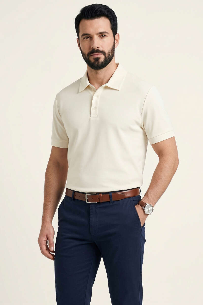 Polo Yaka Basic Tensel Erkek T-shirt Ekru