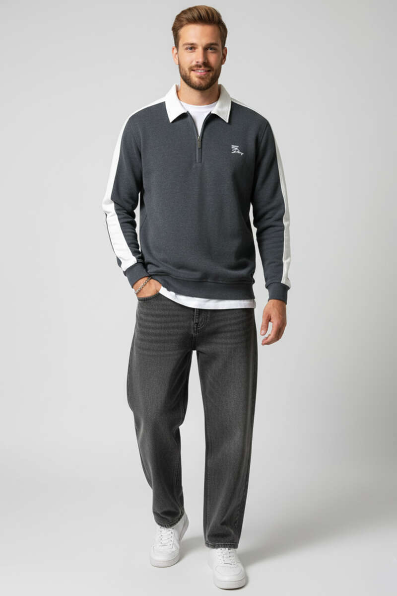 Üç İplik Bisiklet Yaka Erkek Sweatshirt Saks