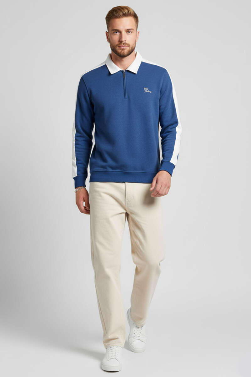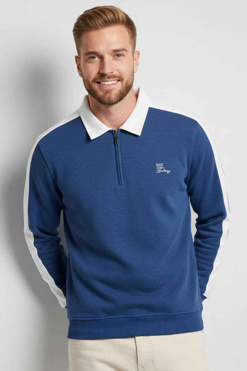 Gömlek Yaka Üç İplik Erkek Sweatshirt Mavi
