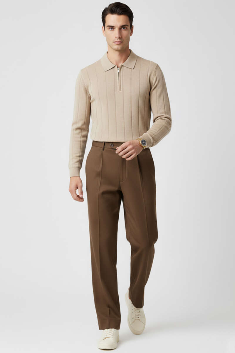 Yaka Fermuarlı Triko Erkek Kazak Kahve