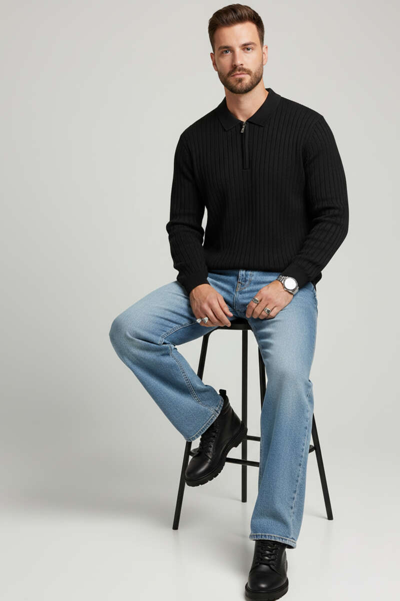 Balıkçı Yaka Fermuarlı Erkek Triko Kazak Siyah