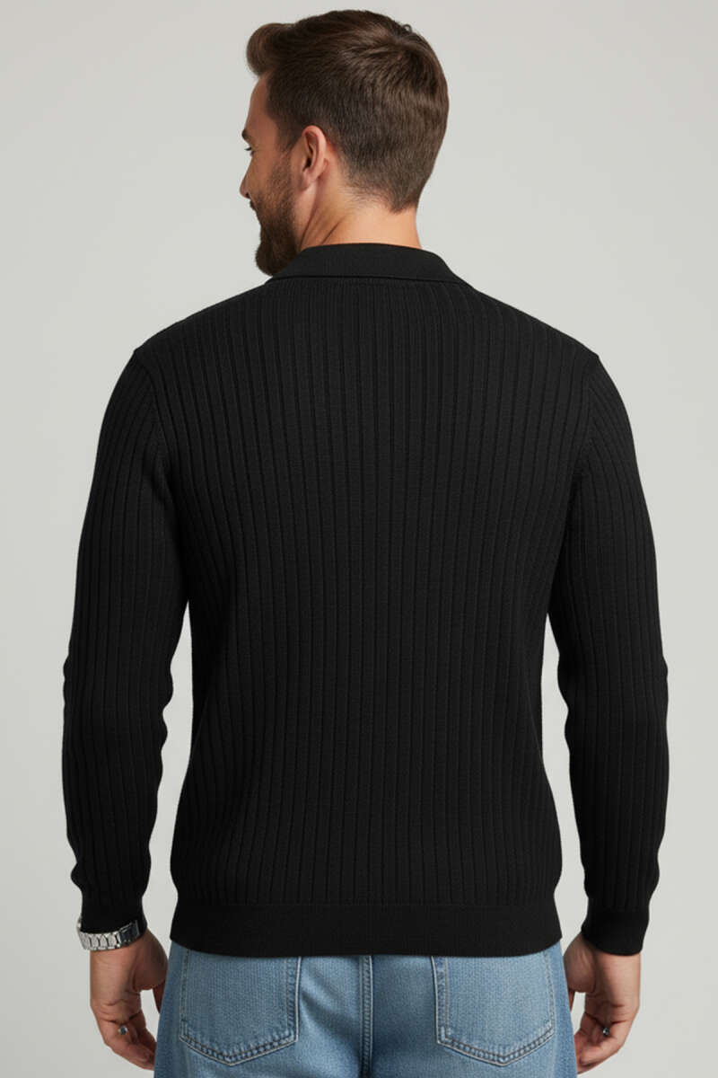 Polo Yaka Çizgi Desenli Kazak Siyah