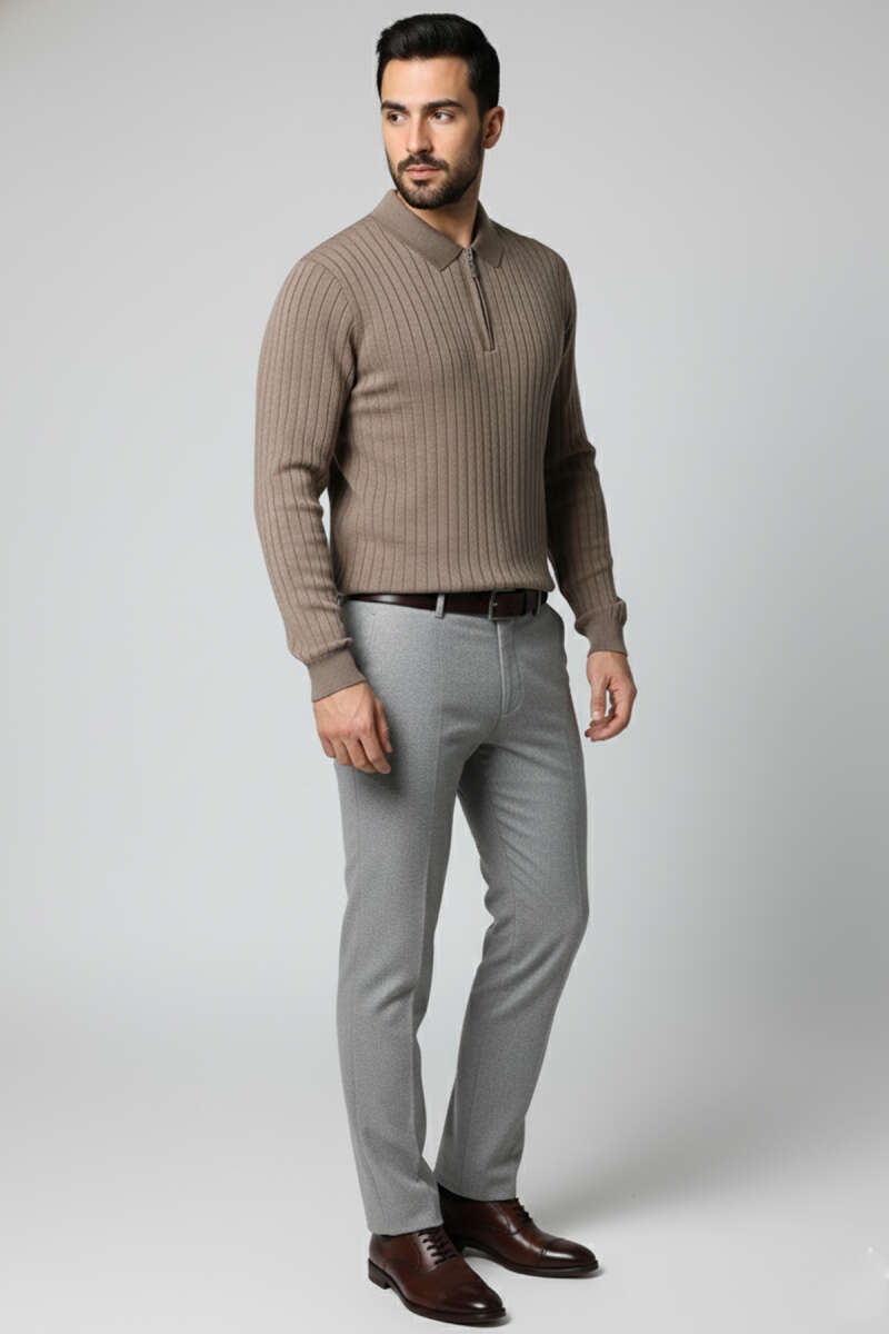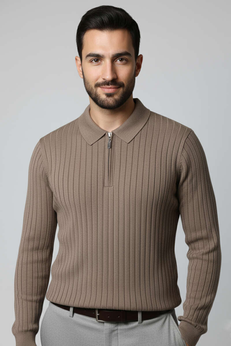 Polo Yaka Çizgi Detaylı Erkek Kazak Taş