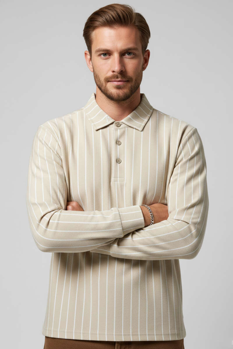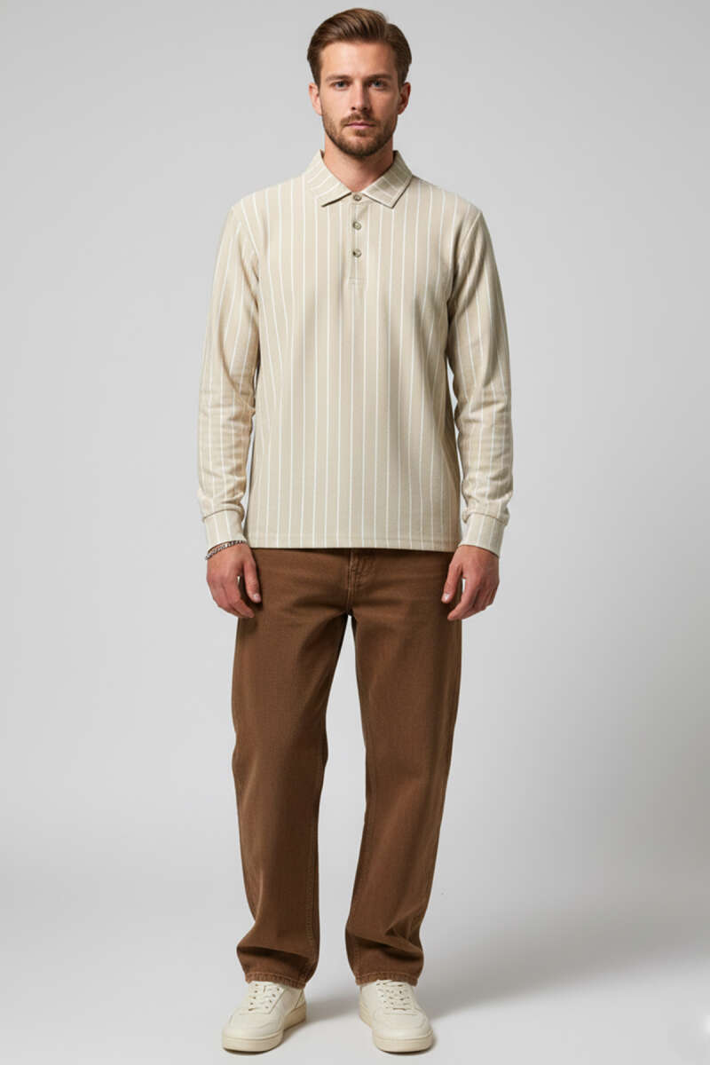 Polo Yaka Çizgili Uzun Kollu Erkek T-shirt Haki