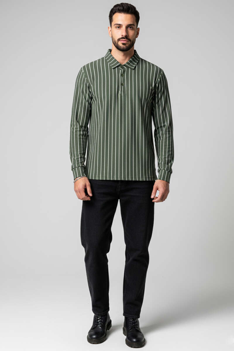Polo Yaka Çizgili Uzun Kollu Erkek T-shirt Beyaz