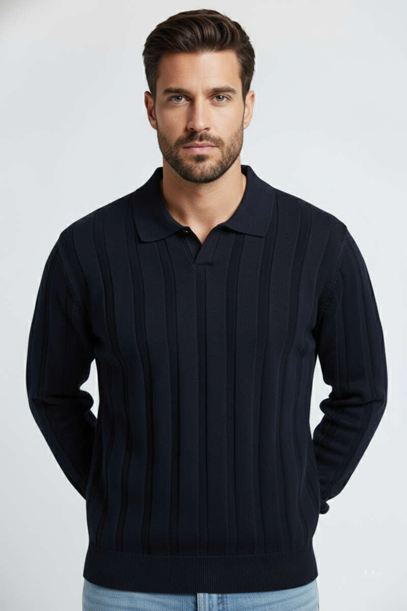 Polo Yaka Dikey Çizgili Triko Erkek Kazak Ekru