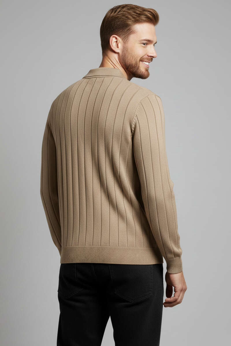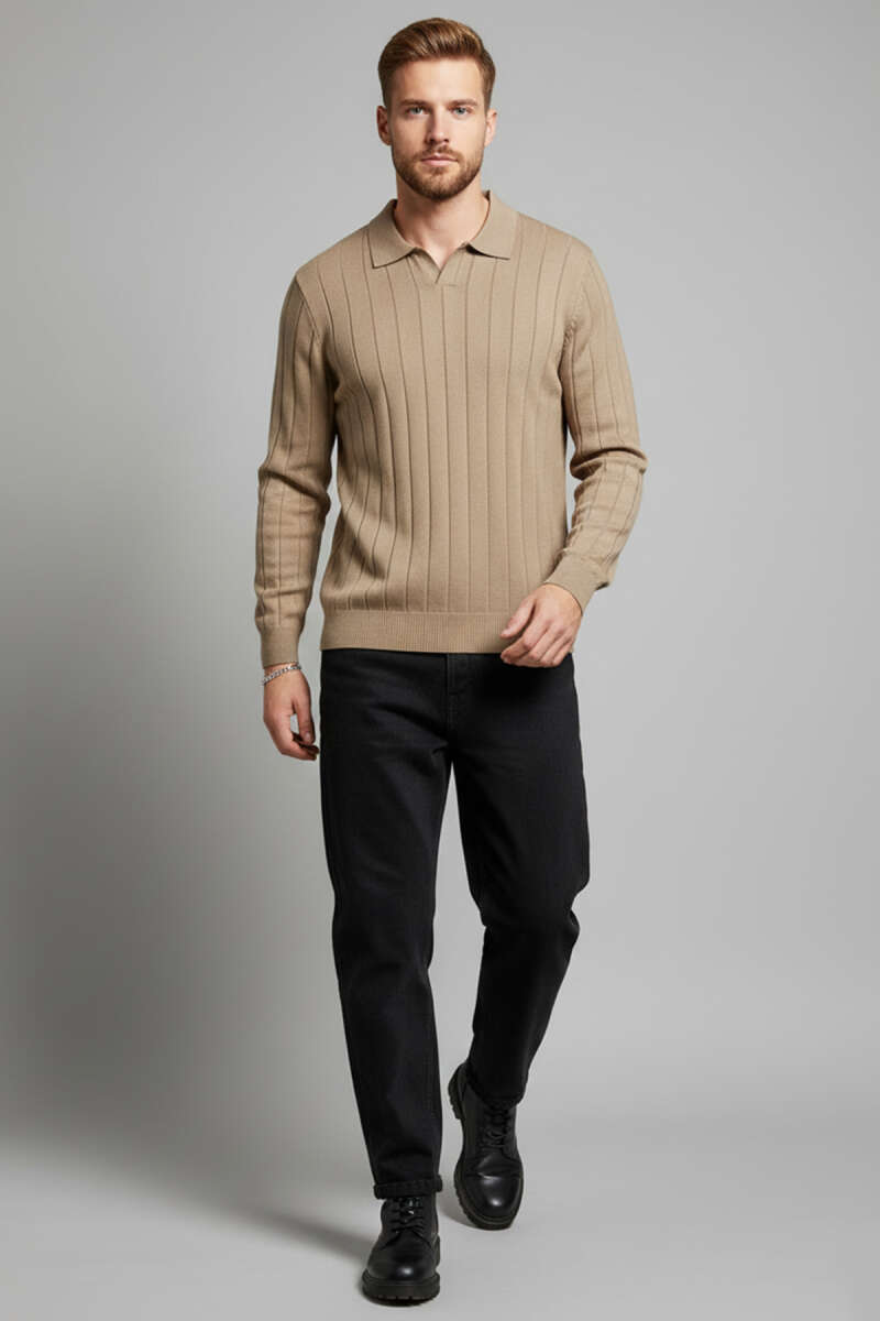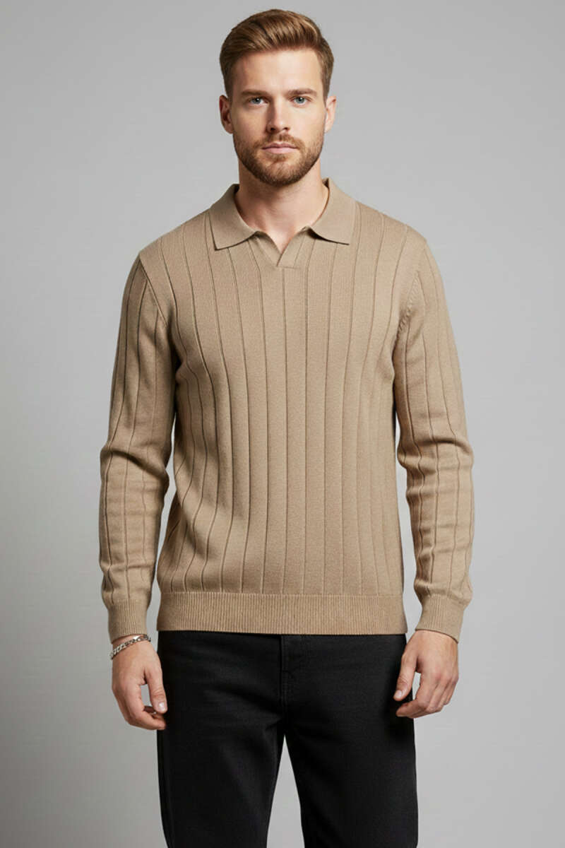 Polo Yaka Çizgi Detaylı Erkek Kazak Vizon