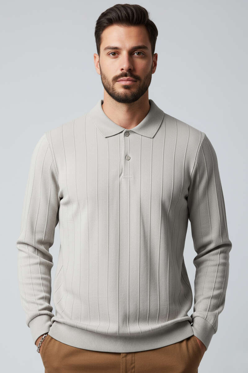 Polo Yaka Petek Örme Detaylı Triko Erkek Kazak Ekru