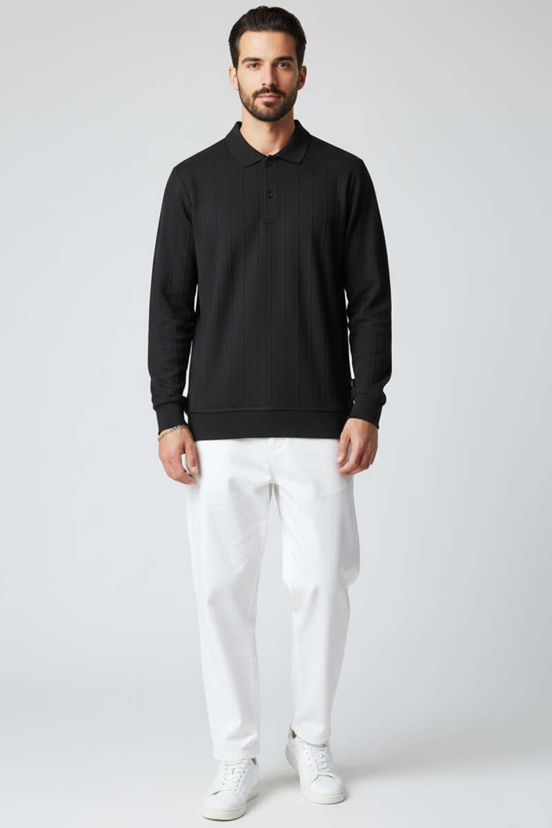 Polo Yaka Petek Örme Detaylı Triko Erkek Kazak Siyah