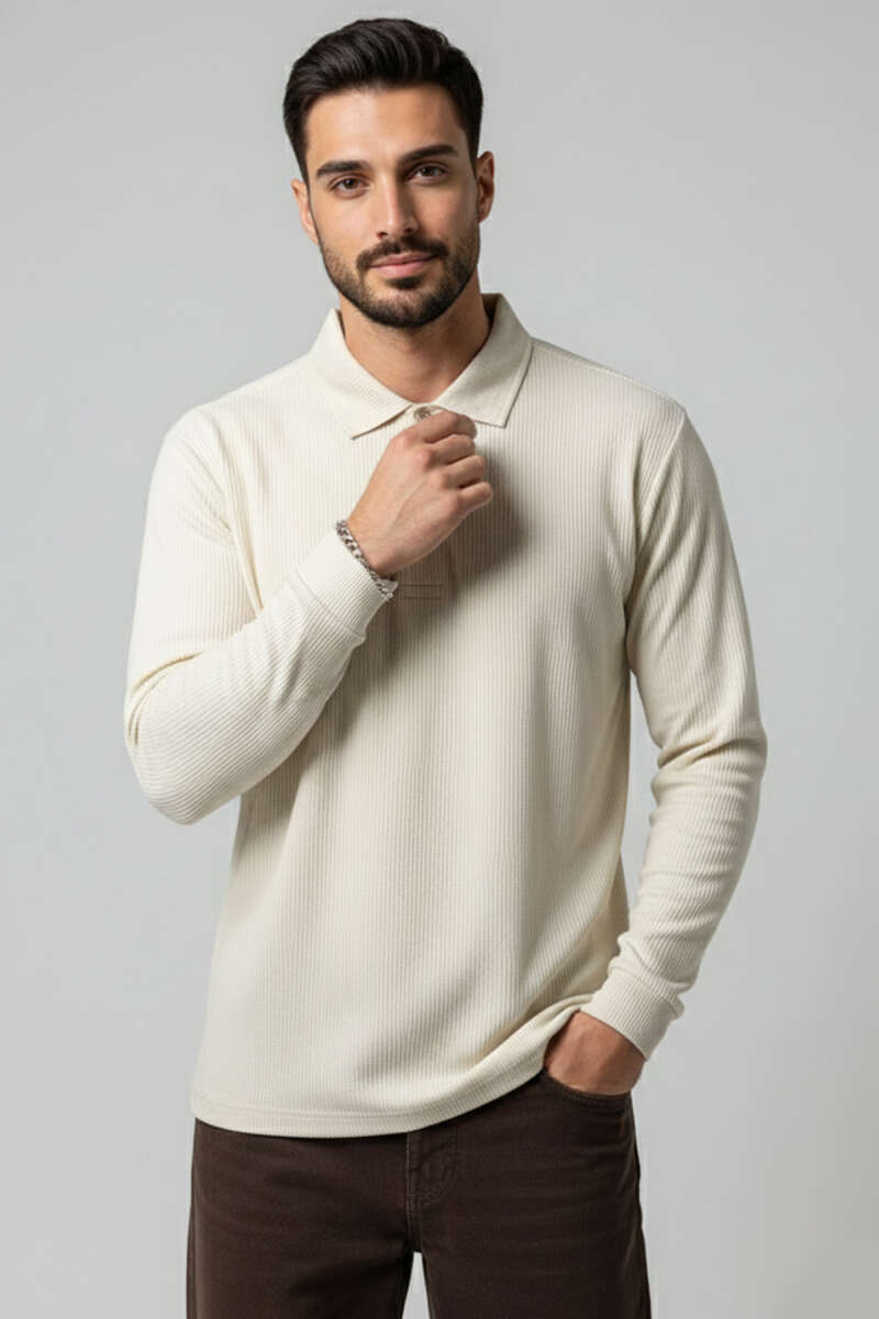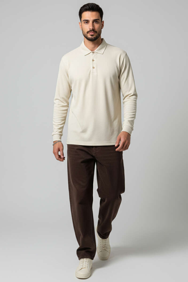 Polo Yaka Düğmeli Çizgili Sweatshirt Taş