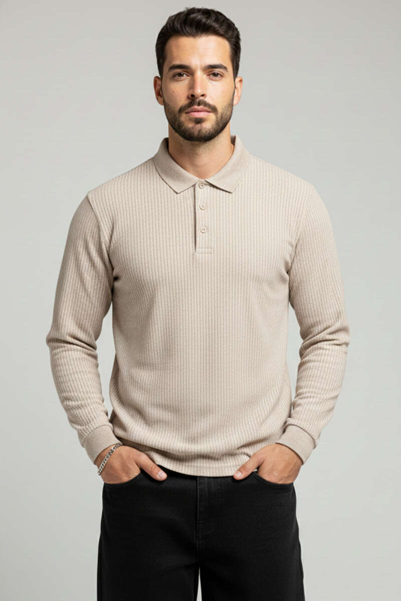 Polo Yaka Düğmeli Çizgili Sweatshirt Bej