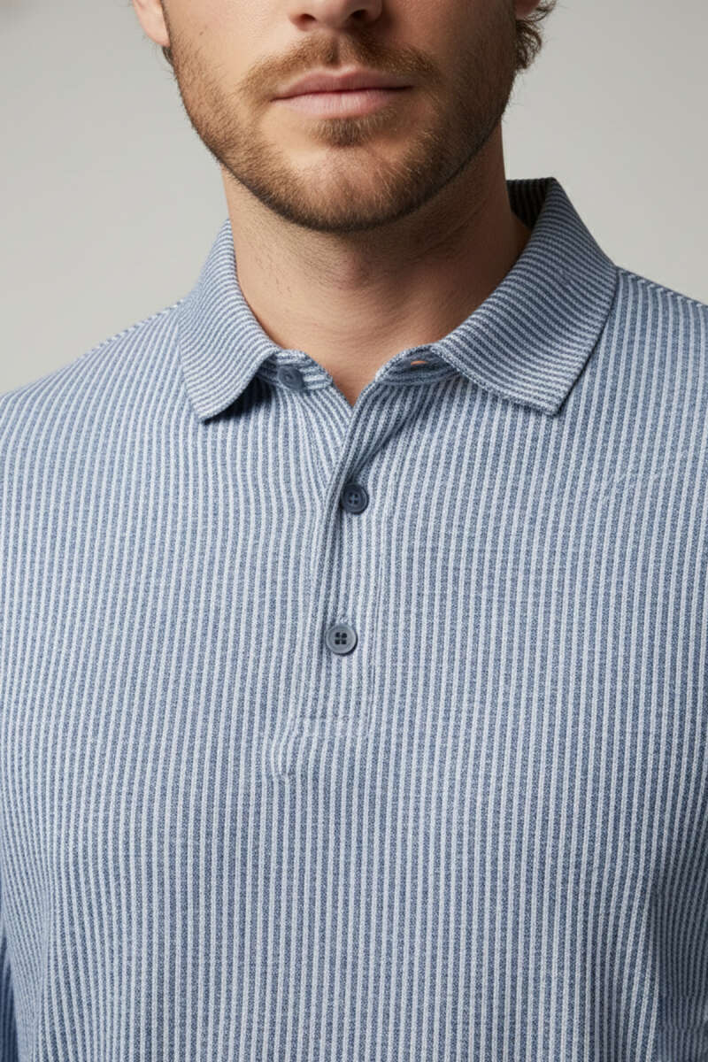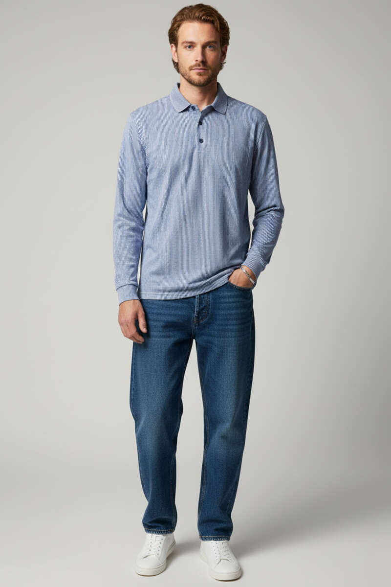 Polo Yaka Düğmeli Çizgili Sweatshirt Lacivert