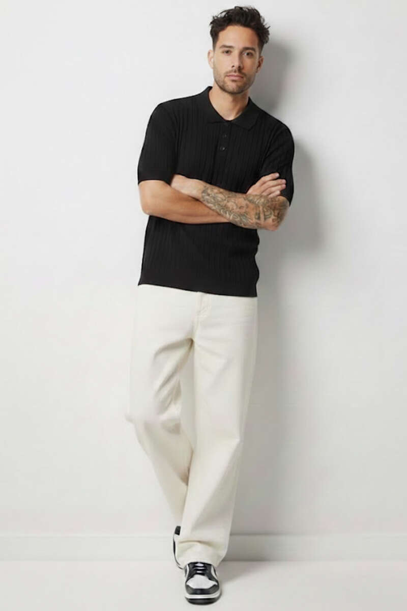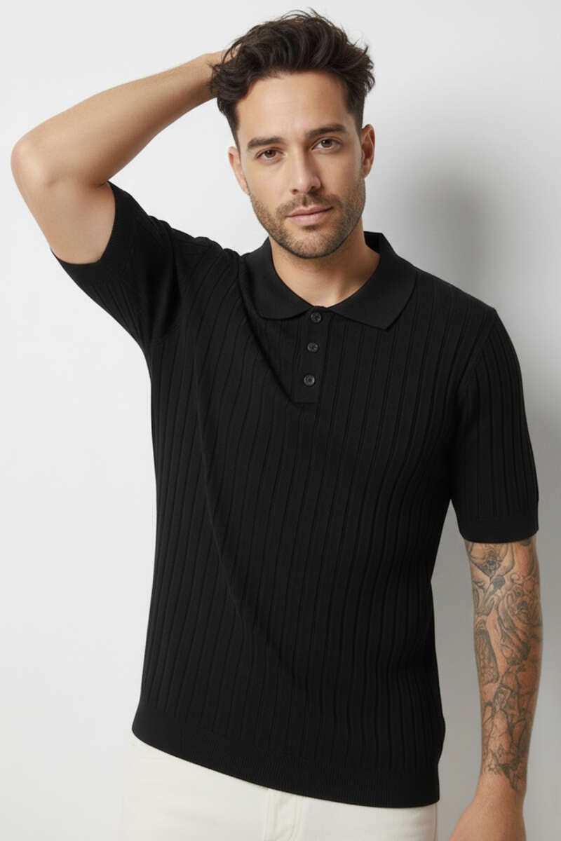 Polo Yaka Düğmeli Merserize T-Shirt Siyah