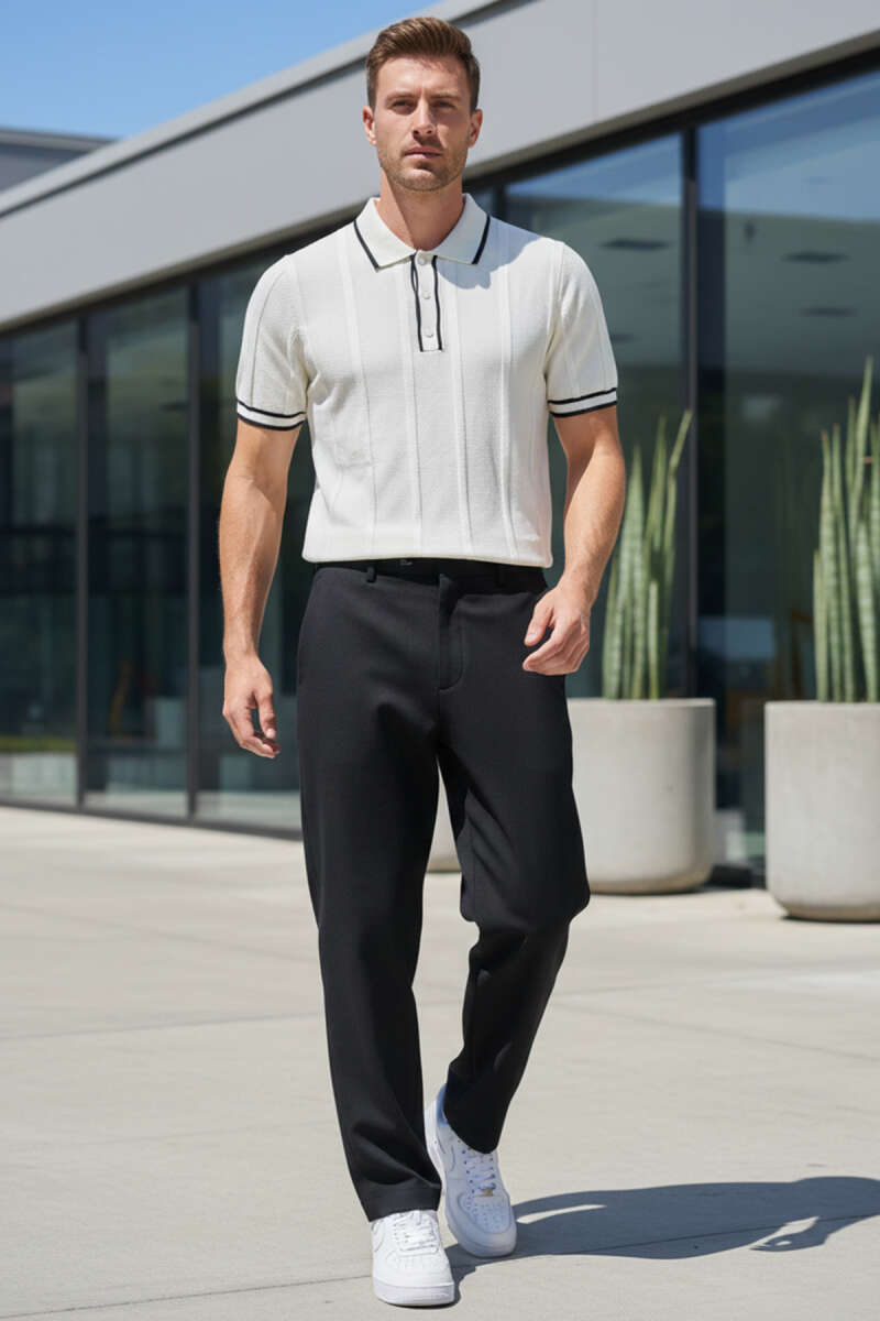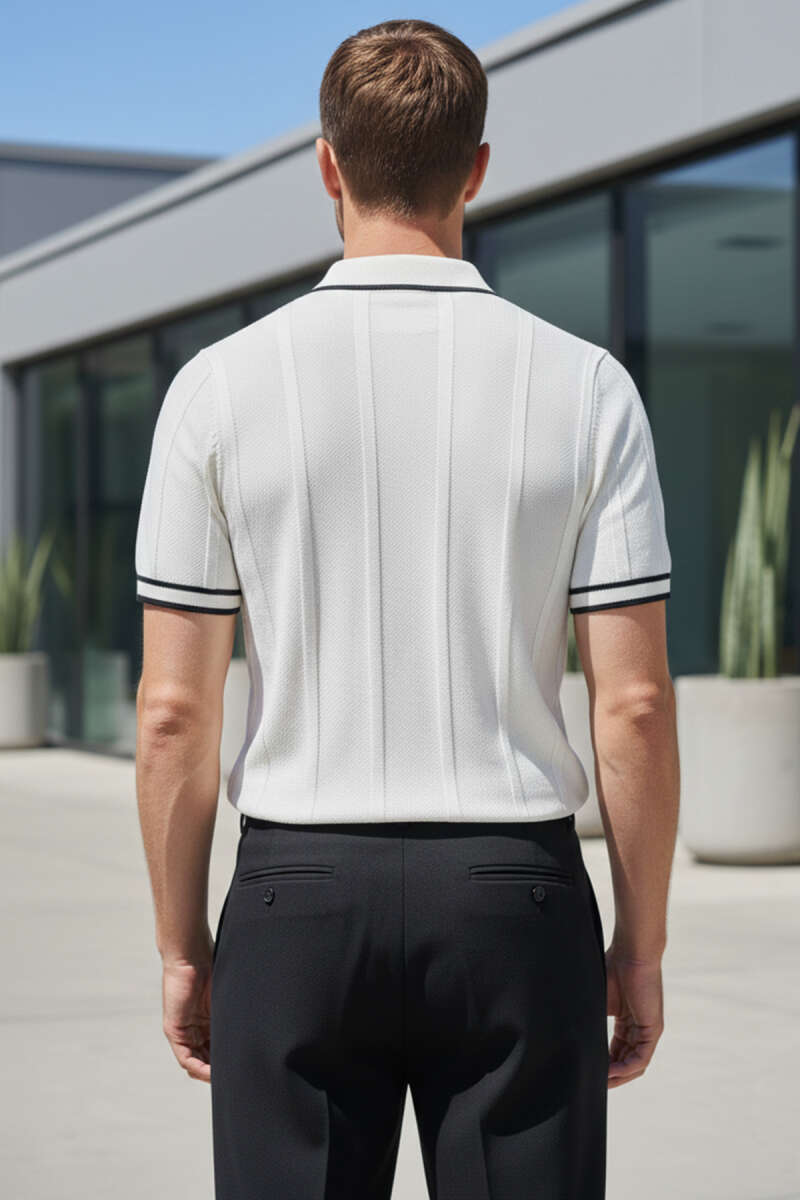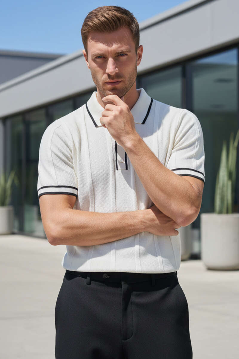 Polo Yaka Düğmeli Örme Erkek T-shirt Krem