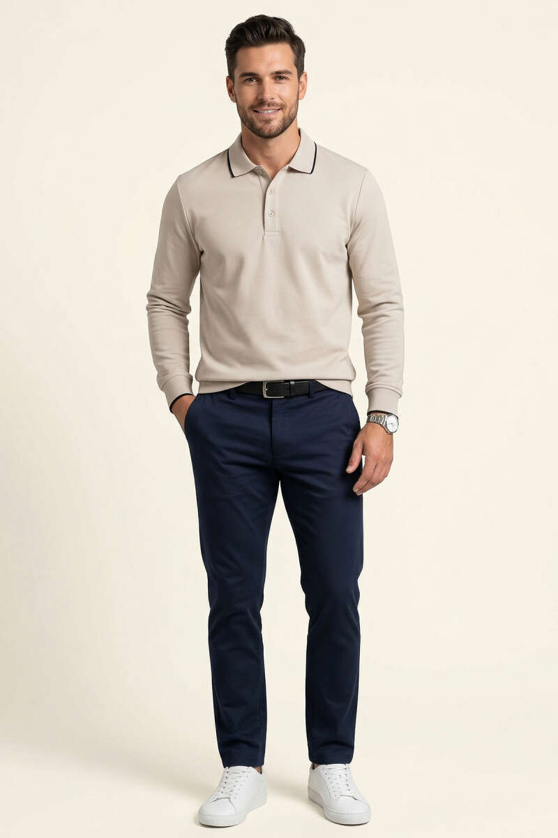 Polo Yaka Düğmeli Uzun Kol Sweatshirt Bej