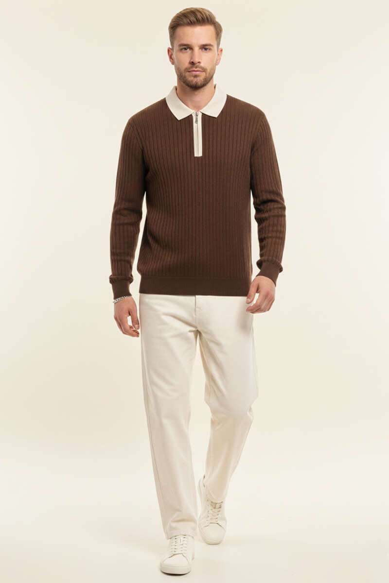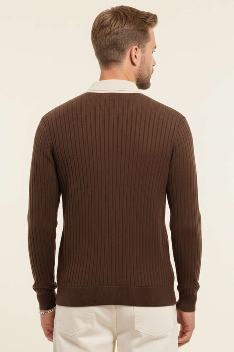Polo Yaka Dikey Çizgili Triko Erkek Kazak Kahve