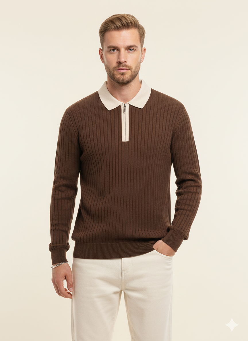 Polo Yaka Fermuarlı Fitilli Erkek Kazak Nefti